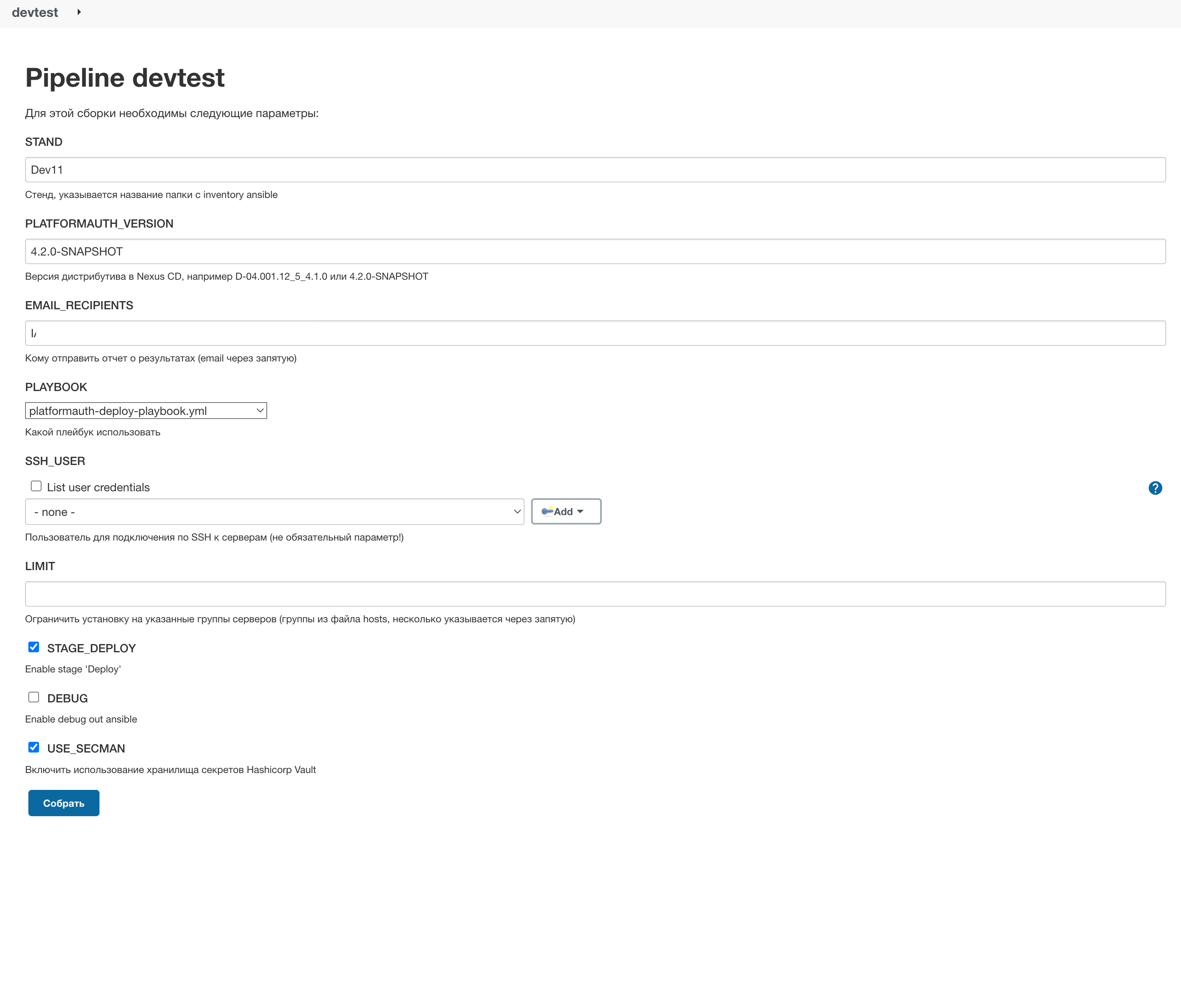 vault_approle_idиvault_approle_secret_id(role_idиsecret_id) рекомендуется задавать, как параметры при запуске ansible-playbook (в job pipeline из дистрибутива используется jenkins-cred-id="vault_approle_creds" с типом usernamePassword, для заданияrole_idиsecret_id). Или до запуска установки доставлятьrole_idиsecret_idна сервера в файлы /opt/vault/tokens/roleid и /opt/vault/secrets/secretid (в последнем случае vault_approle_id и vault_approle_secret_id не нужно задавать в профиле установки, и нужно убрать их из профиля).