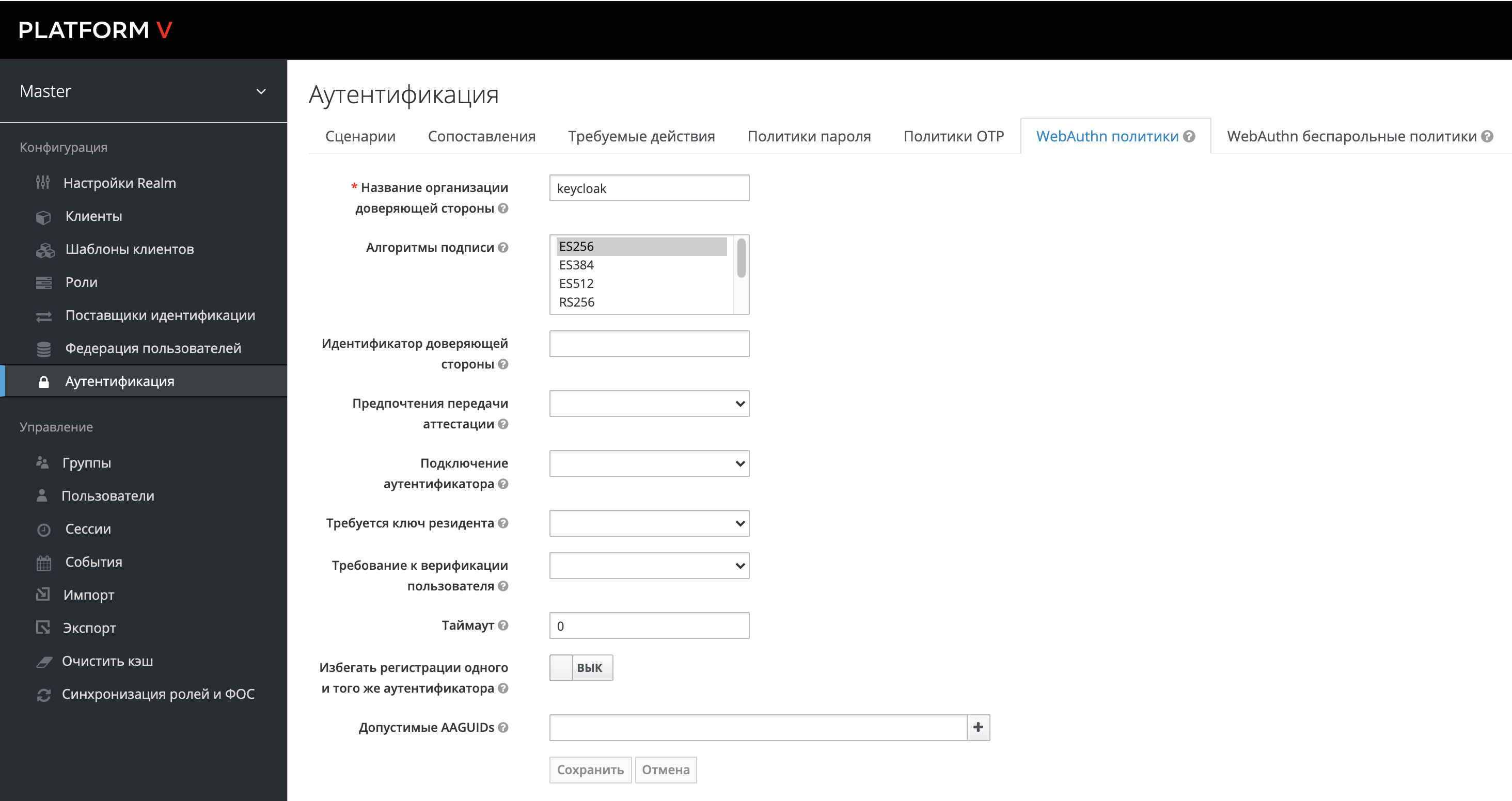 Политика для аутентификации WebAuthn используется требуемым действием 'WebAuthn Register' и аутентификатором 'WebAuthn Authenticator'. Обычно включается, когда WebAuthn используется для двухфакторной аутентификации.