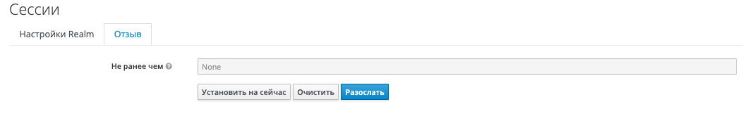 С помощью этой консоли указывается время и дата, когда сеансы или токены, выпущенные до этого времени и даты, будут недействительными. Для настройки требуется нажать Установить на сейчас, чтобы установить политику на текущее время и дату. При нажатии на кнопку Разослать, политика отзыва отправится любому зарегистрированному клиенту OIDC с помощью адаптера клиента OIDC Keycloak.