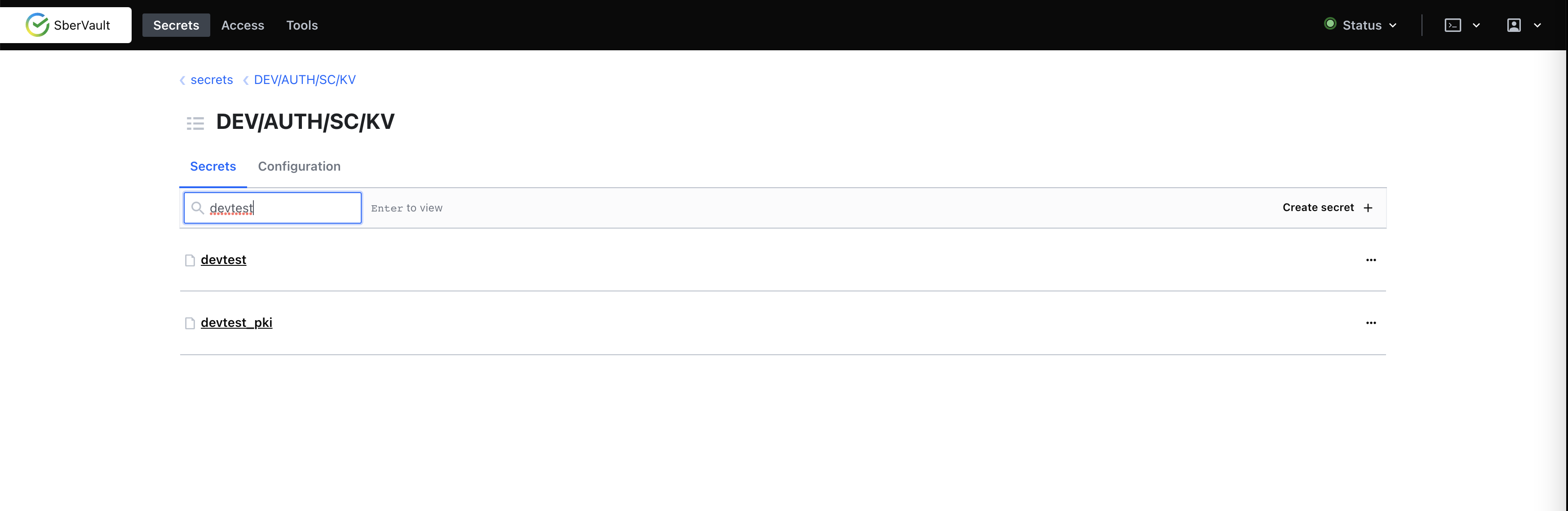 KVдля размещения паролей и т.п., где в ключе задается имя переменной, а в значении пароль. Имена ключей(переменных) должны соответствовать именам приведенных в Таблице 1 (эти имена используются в ansible при установке, вmain_vault.yml, а путь до хранилища задается в переменной ansible-inventoryvault_secret).