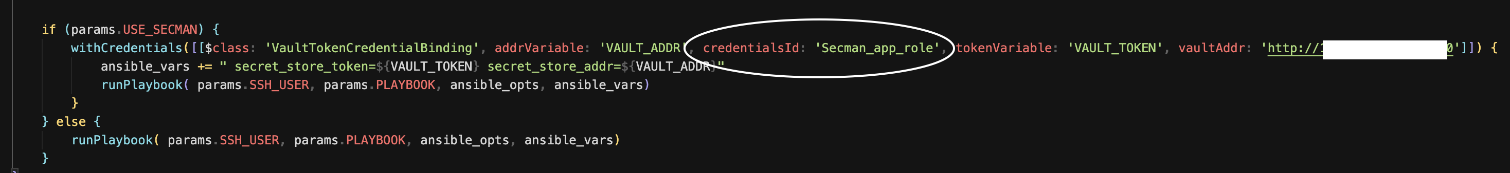 vault_approle_idиvault_approle_secret_id(role_idиsecret_id) рекомендуется задавать, как параметры при запуске ansible-playbook (в job pipeline из дистрибутива используется jenkins-cred-id="vault_approle_creds" с типом usernamePassword, для заданияrole_idиsecret_id). Или до запуска установки доставлятьrole_idиsecret_idна сервера в файлы /opt/vault/tokens/roleid и /opt/vault/secrets/secretid (в последнем случае vault_approle_id и vault_approle_secret_id не нужно задавать в профиле установки, и нужно убрать их из профиля).