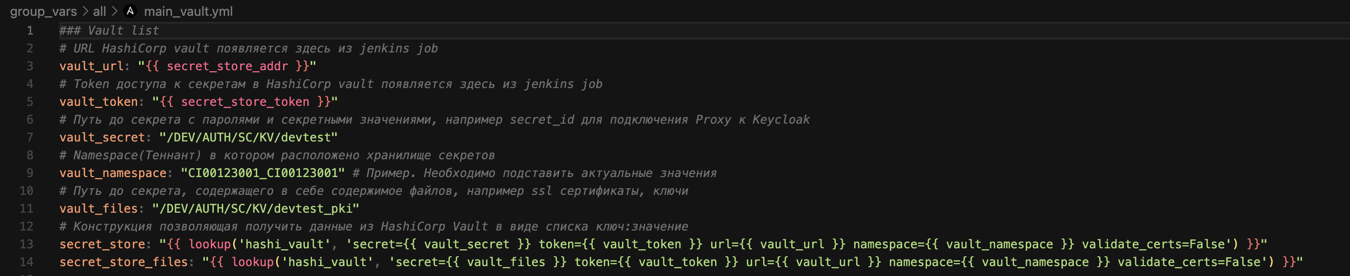main_vault.ymlуказать пути к хранилищам секретов (созданных выше) используемых в ansible. В переменнойvault_secretуказать путь до хранилища с паролями и т.п., а вvault_filesуказать путь до хранилища содержащего файлы (сертификаты, ключи, keystore).Если используется Vault Agent на VM, то в