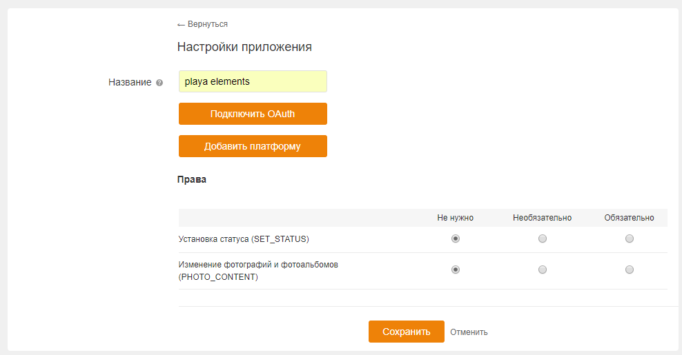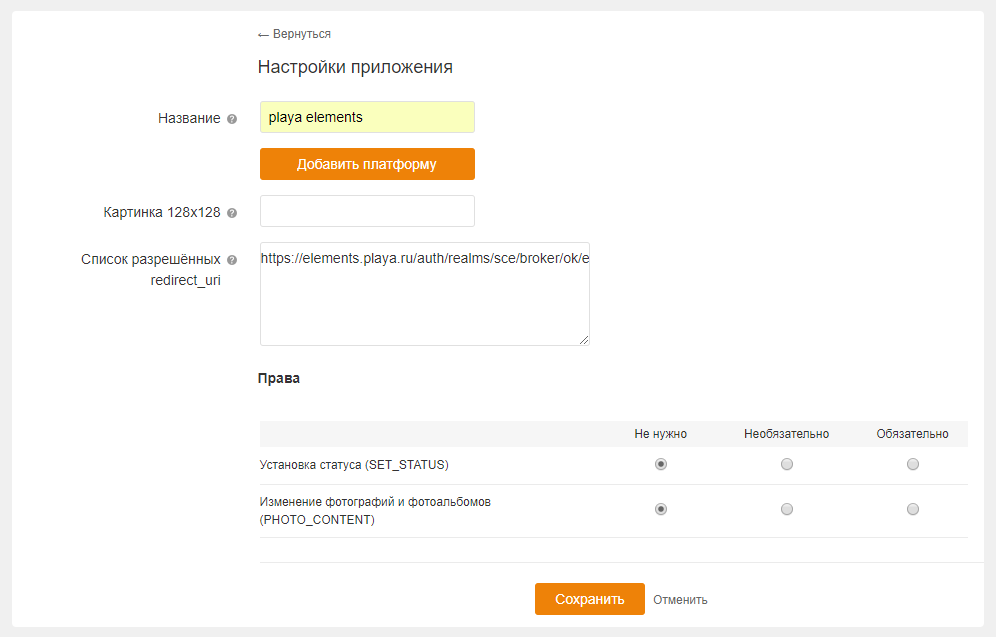 Нажать кнопку Сохранить. На рисунке ниже изображен интерфейс создания приложения.