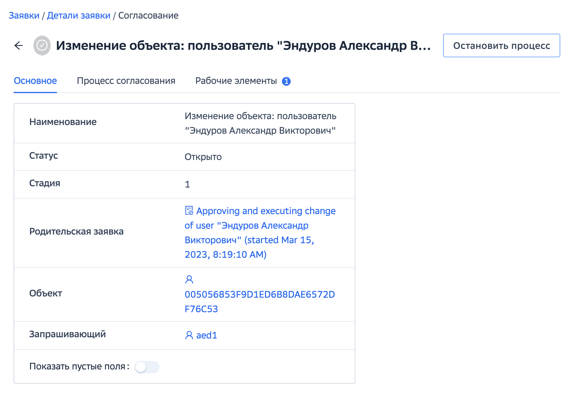 На вкладке Основное отображается информация по заявке на согласование, такая, как статус процесса согласования, объекты, изменения которых согласуются, и инициатор заявки.