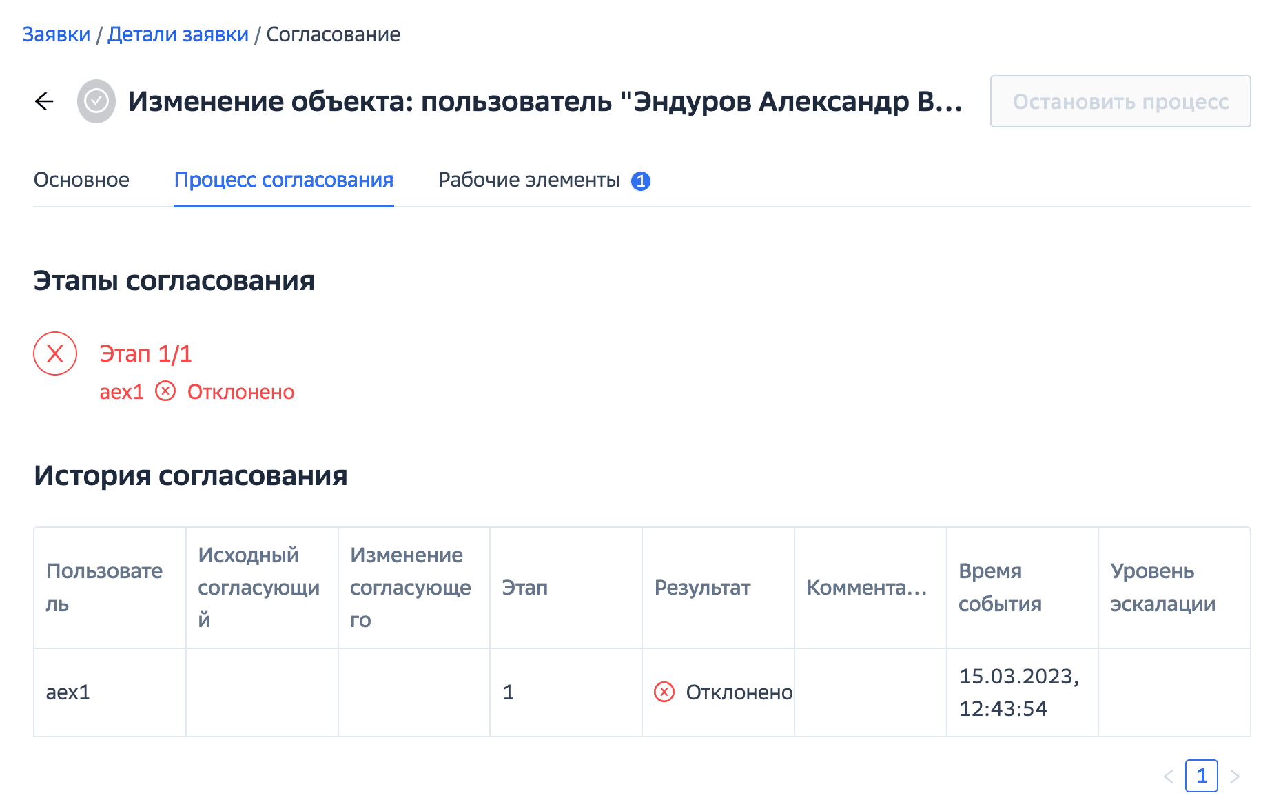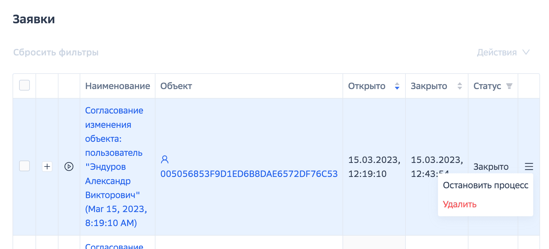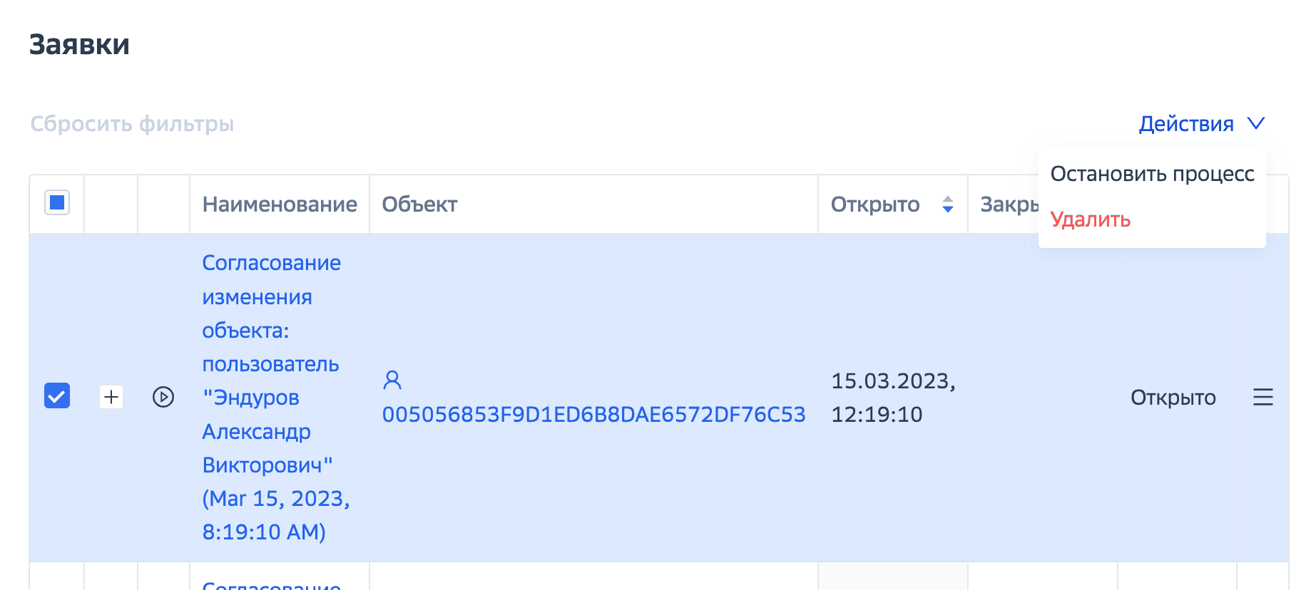 Администратор может в любой момент остановить процесс согласования или удалить заявку. Для этого следует: