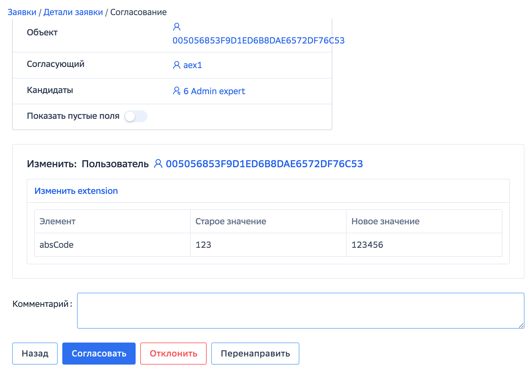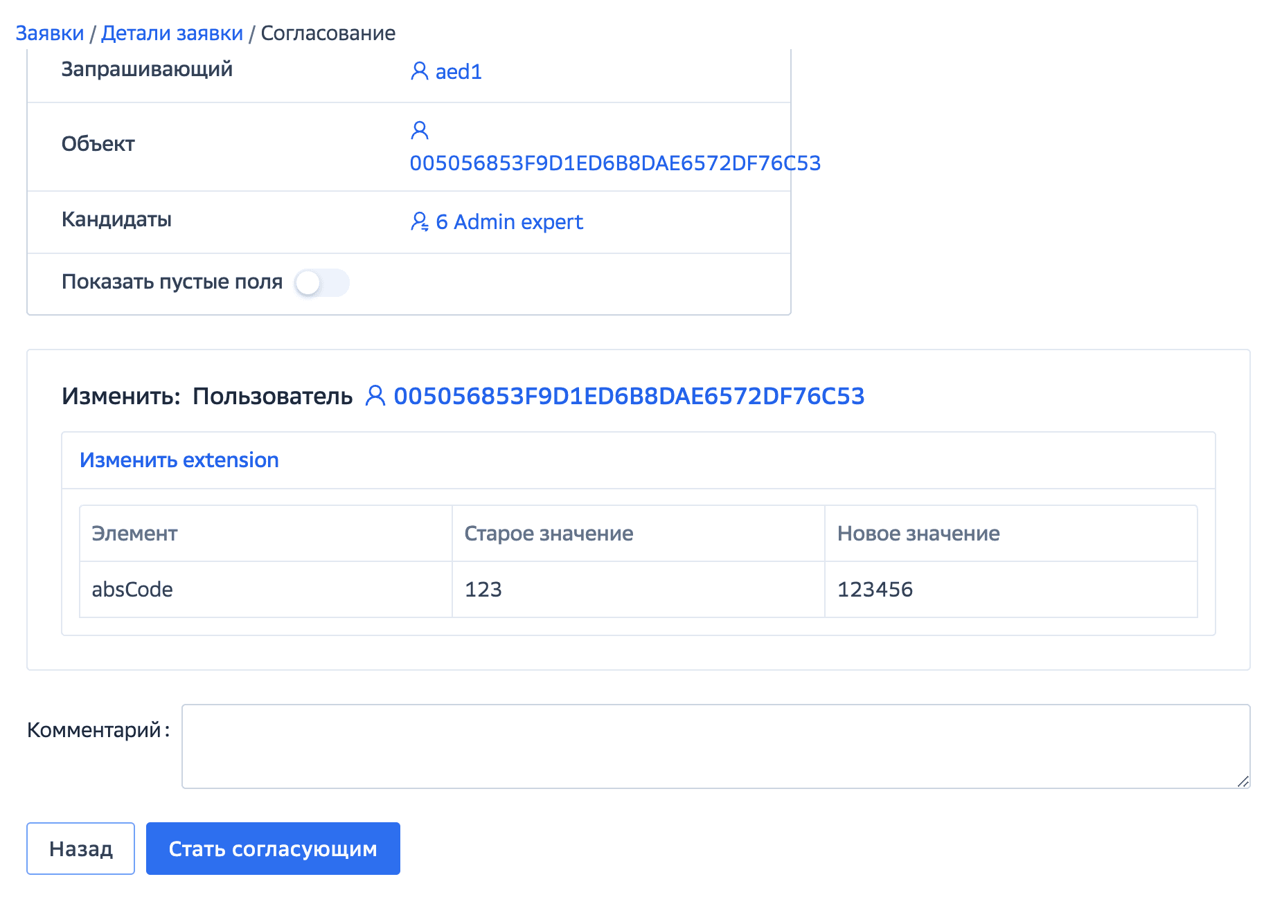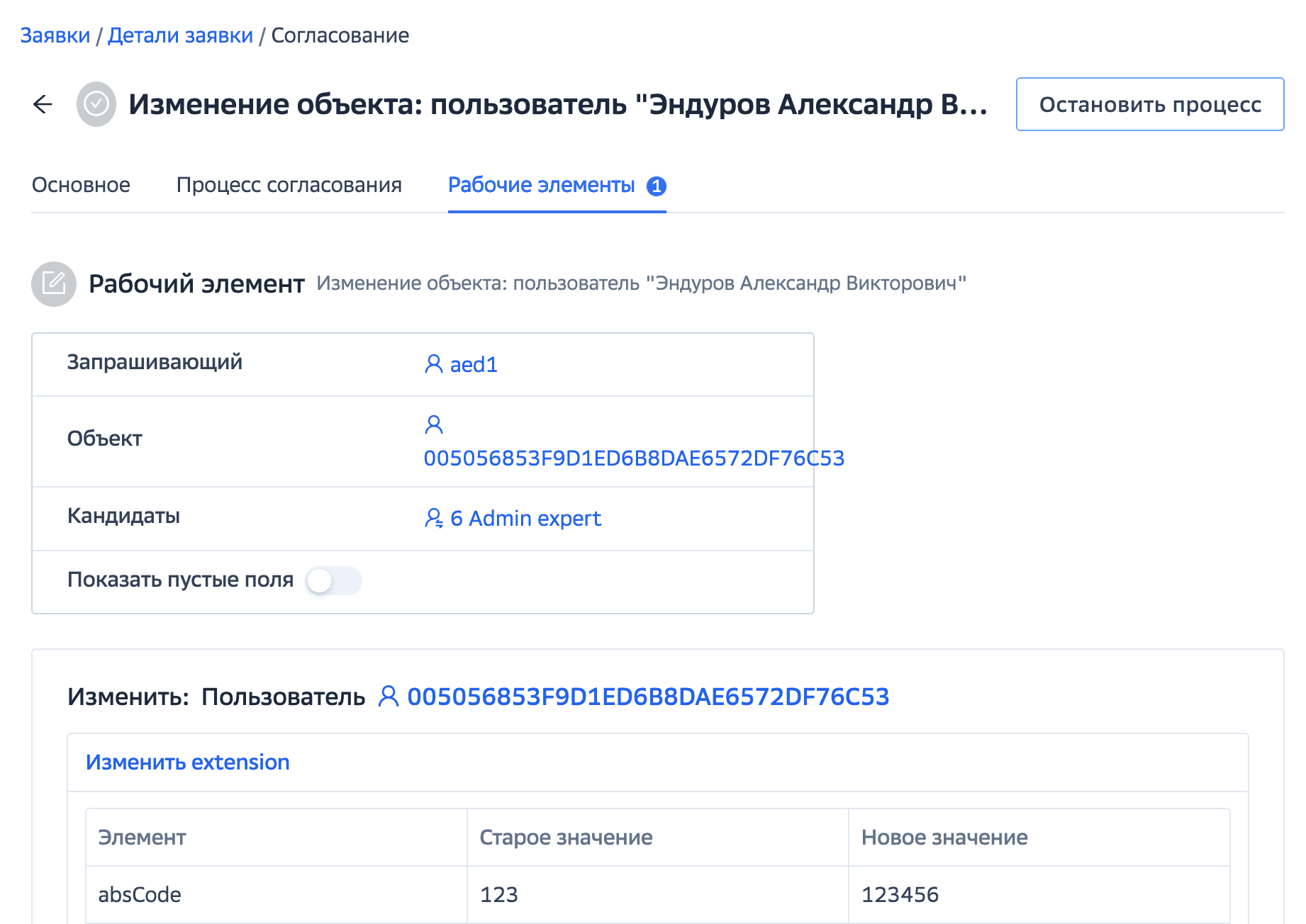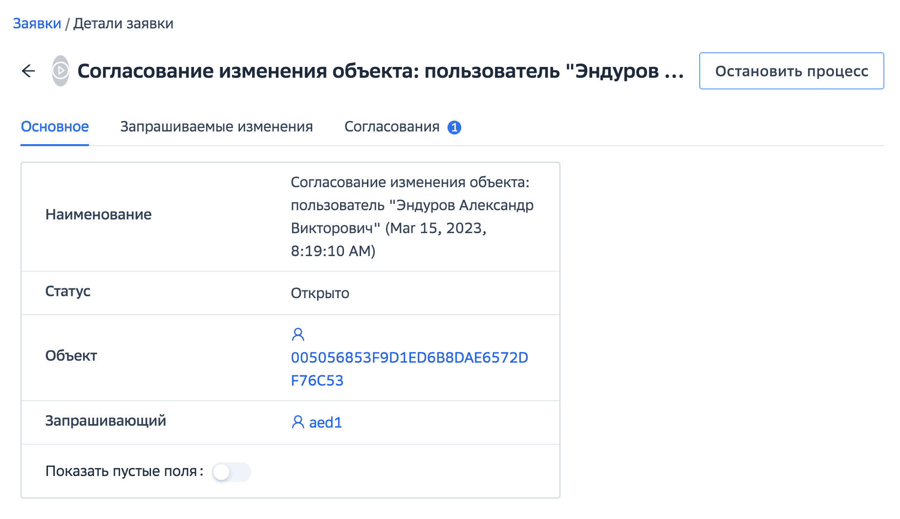 На вкладке Запрашиваемые изменения приводится весь список изменений, которые требуется одобрить, с предыдущими значениями и их предлагаемыми изменениями.