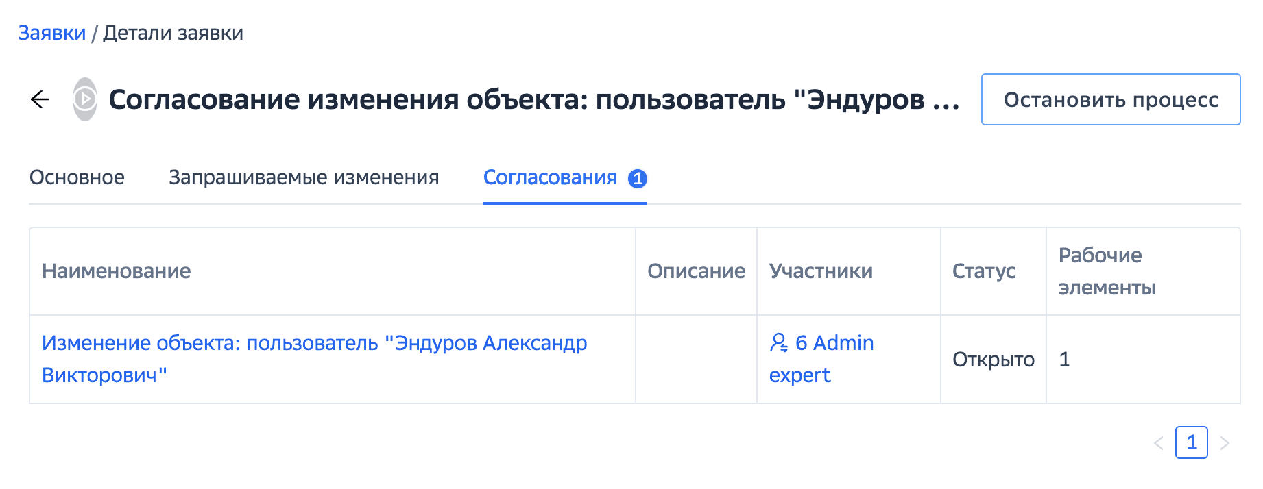 На вкладке Согласование приведен весь список кейсов согласования, которые должны быть одобрены, чтобы изменения в заявке были применены: