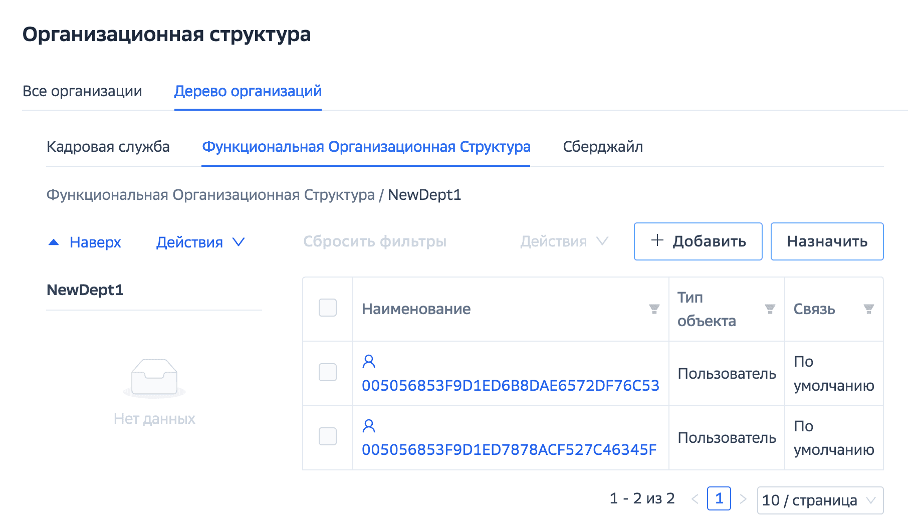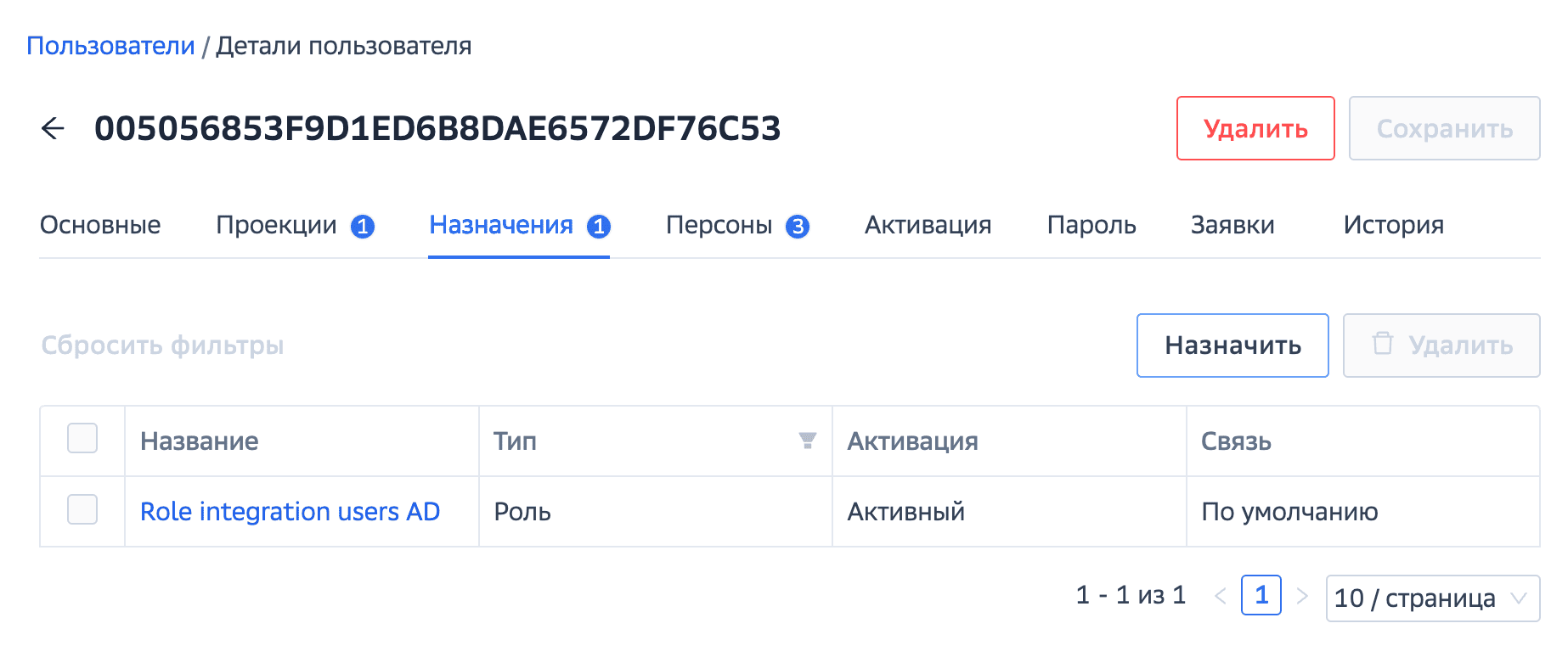 Назначения — назначения пользователя на роли, ресурсы и организации. При этом назначения бывают: