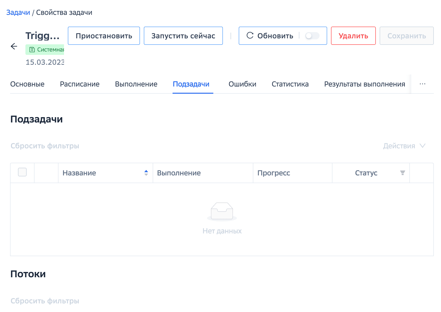 На вкладке Подзадачи отображаются текущие подзадачи и потоки исполнения задачи: