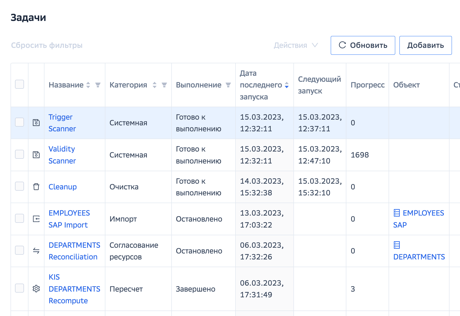 Задача — набор инструкций по исполнению автоматизированных действий по управлению учетными карточками и записями IDMX. Так, если конфигурация ресурса говорит "что" делать с данными, то задача указывает "как" и "когда" это следует сделать. IDMX имеет такие задачи как задача на синхронизацию, на импорт данных из ресурса, и при необходимости в IDMX могут быть добавлены кастомные задачи, созданные под бизнес-логику конкретного Заказчика.
