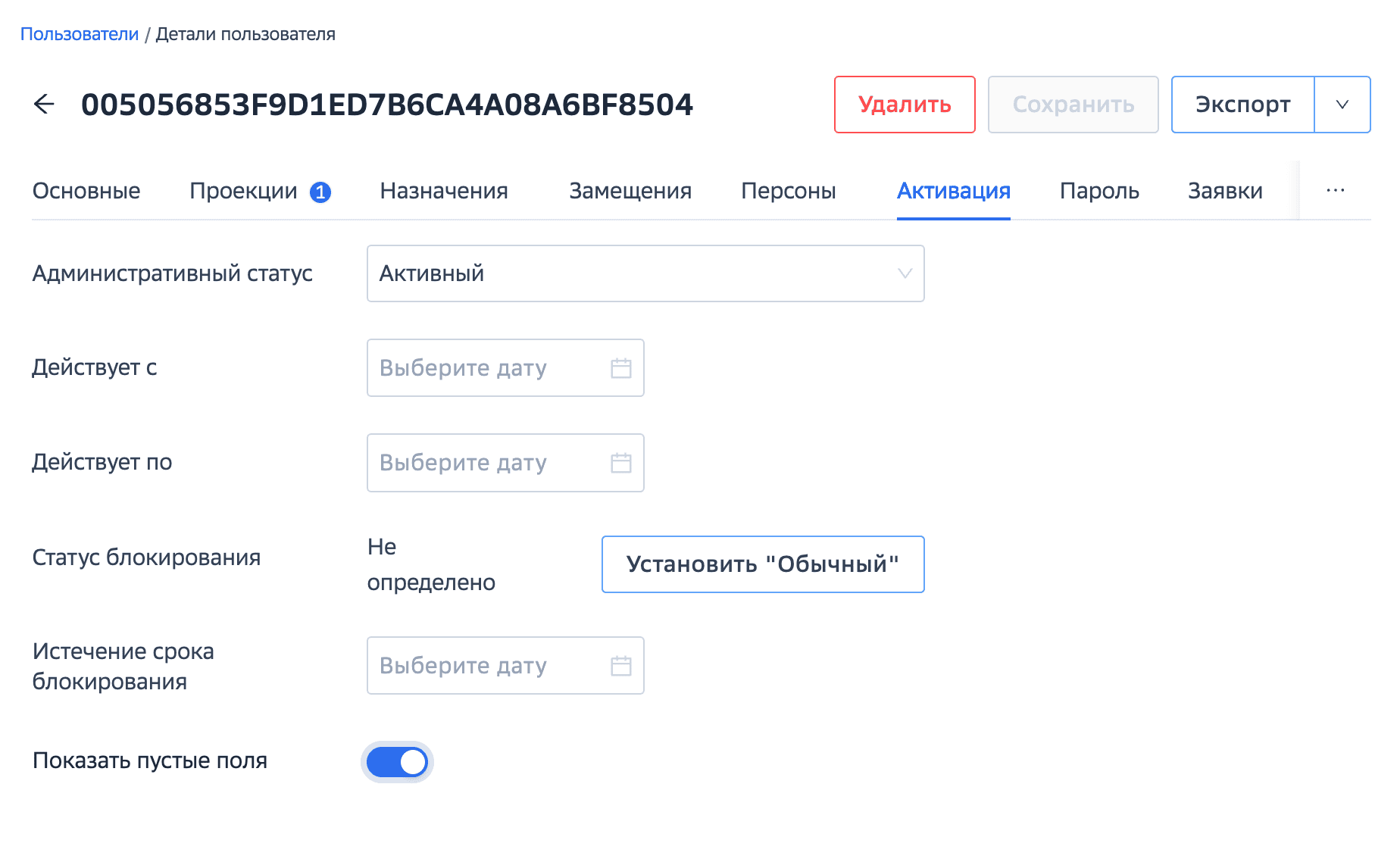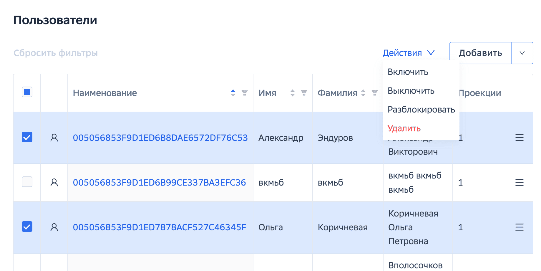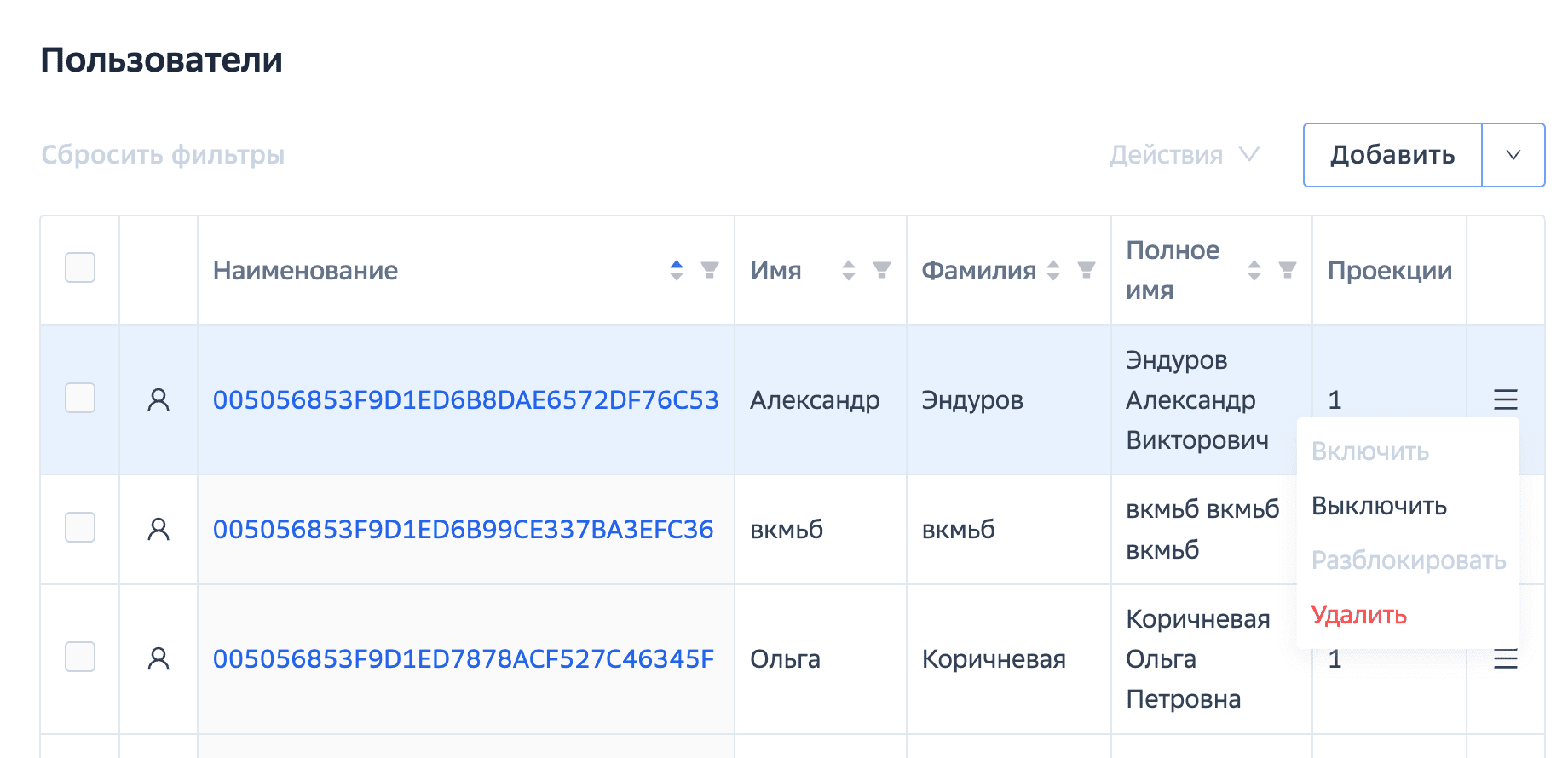 Также администратор может включить, выключить, разорвать связь учетной карточки с учетной записью, разблокировать или удалить одну или несколько проекций. Для этого следует: