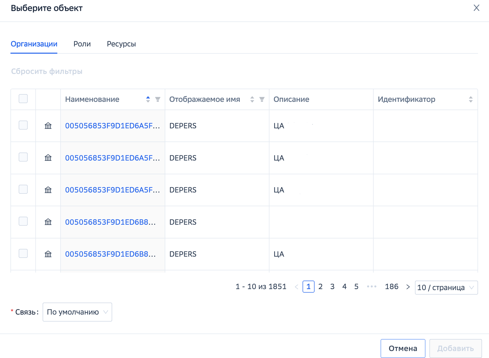 В отобразившемся окне выбрать требуемые объекты (ресурсы / роли / организация) и тип их связи с учетной карточкой (простая связь объектов по умолчанию, или же пользователь является владельцем, согласующим или руководителем для назначенных на него объектов) и нажать кнопку Добавить;