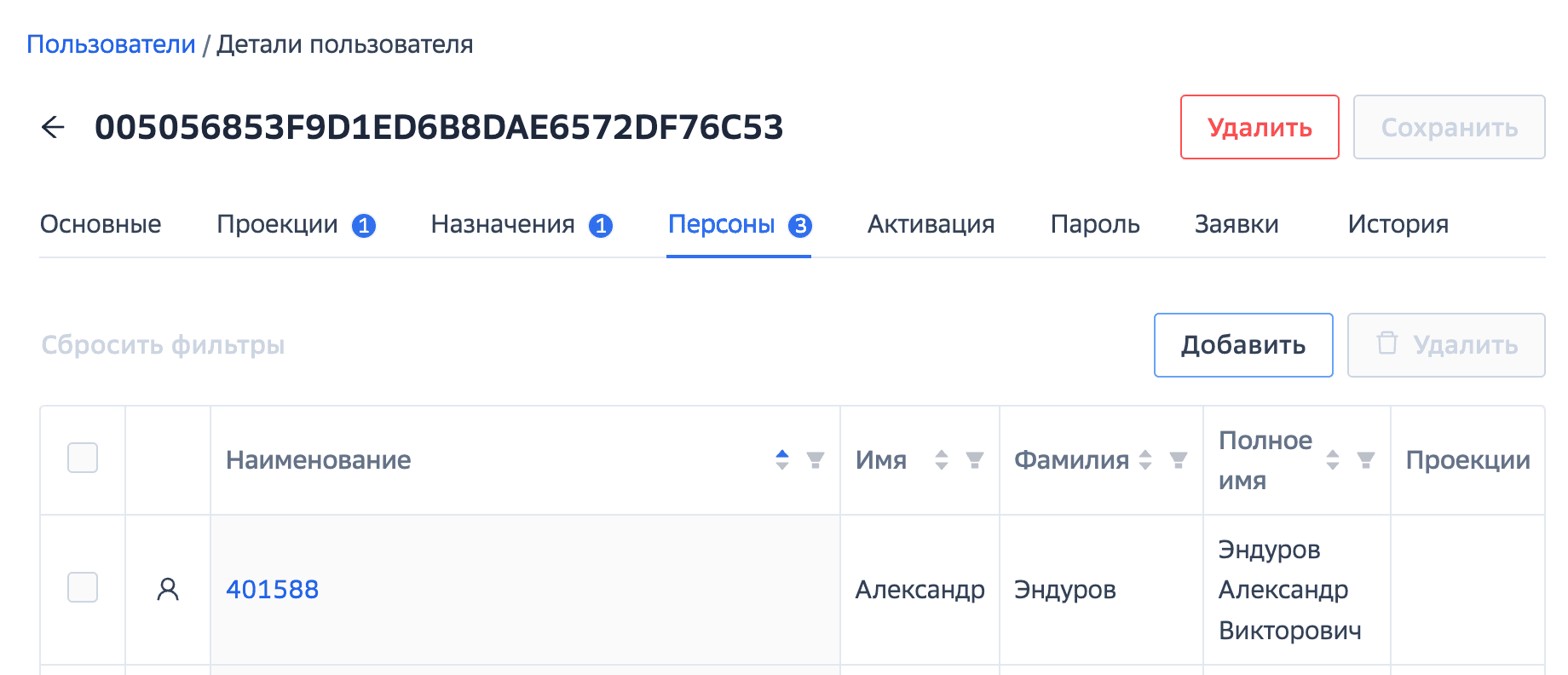 В разделе Персоны администратор может просмотреть список связанных с учетной карточкой персон. Также администратор может добавить или удалить связь учетной карточки с персоной.