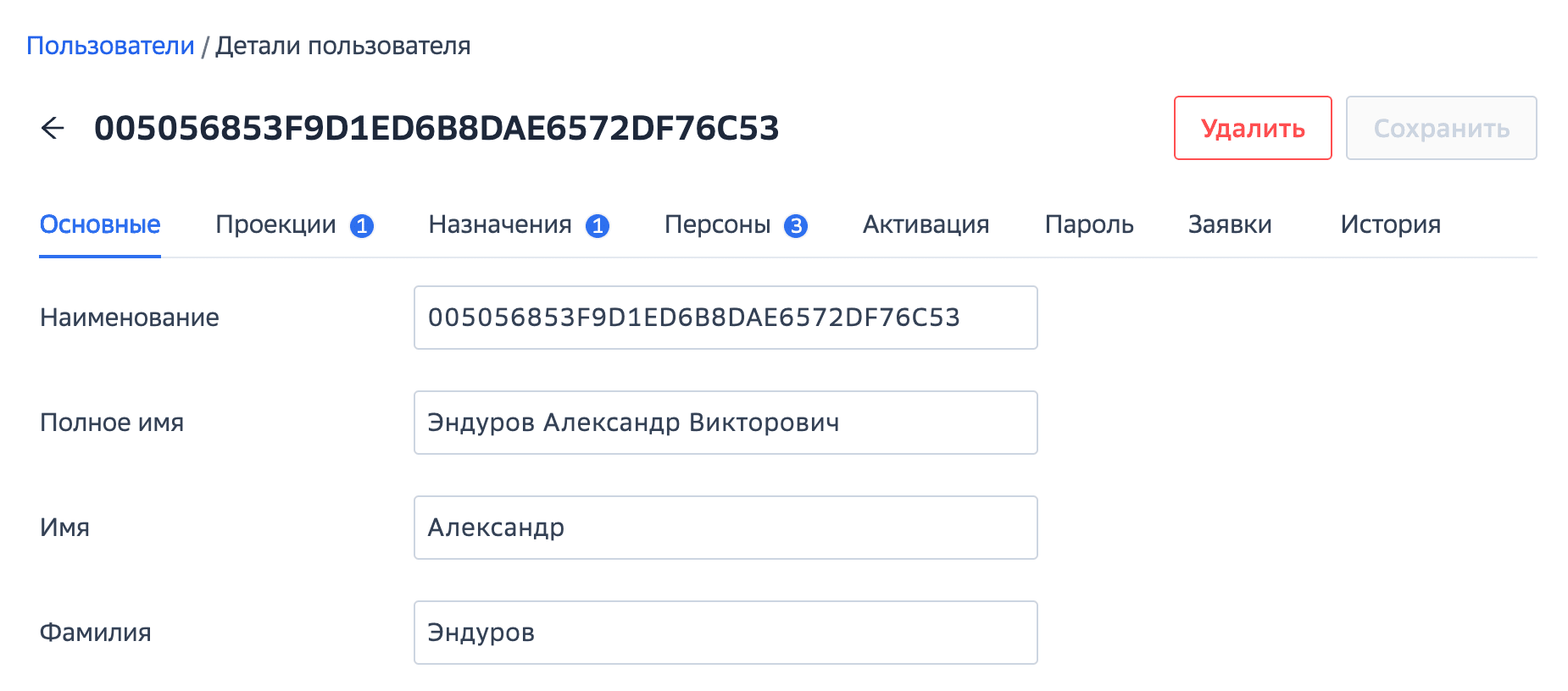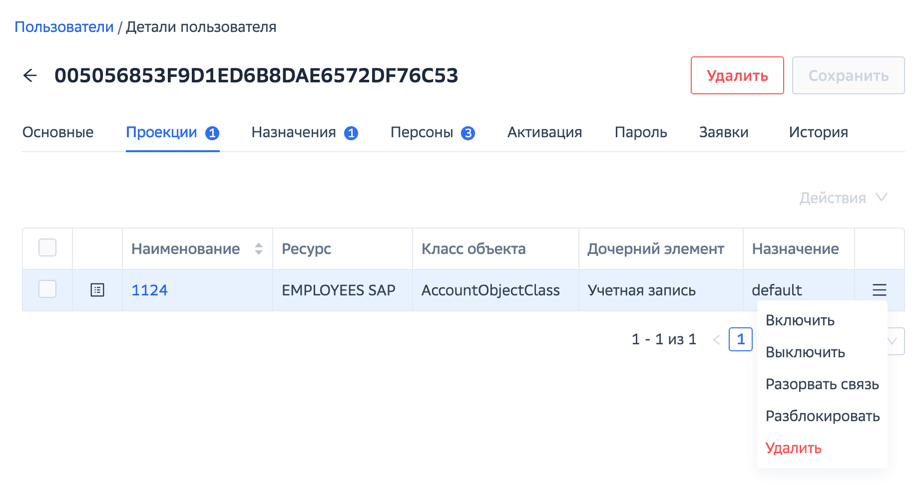 Проекции — количество проекций (учетных записей в ресурсах, привязанных к данной учетной карточке) пользователя.