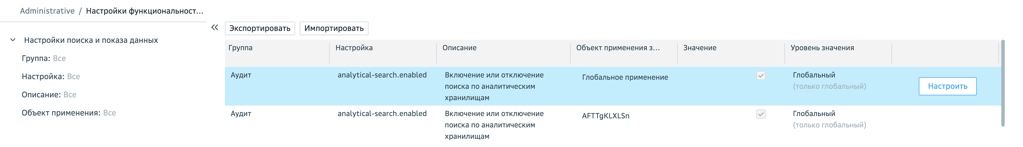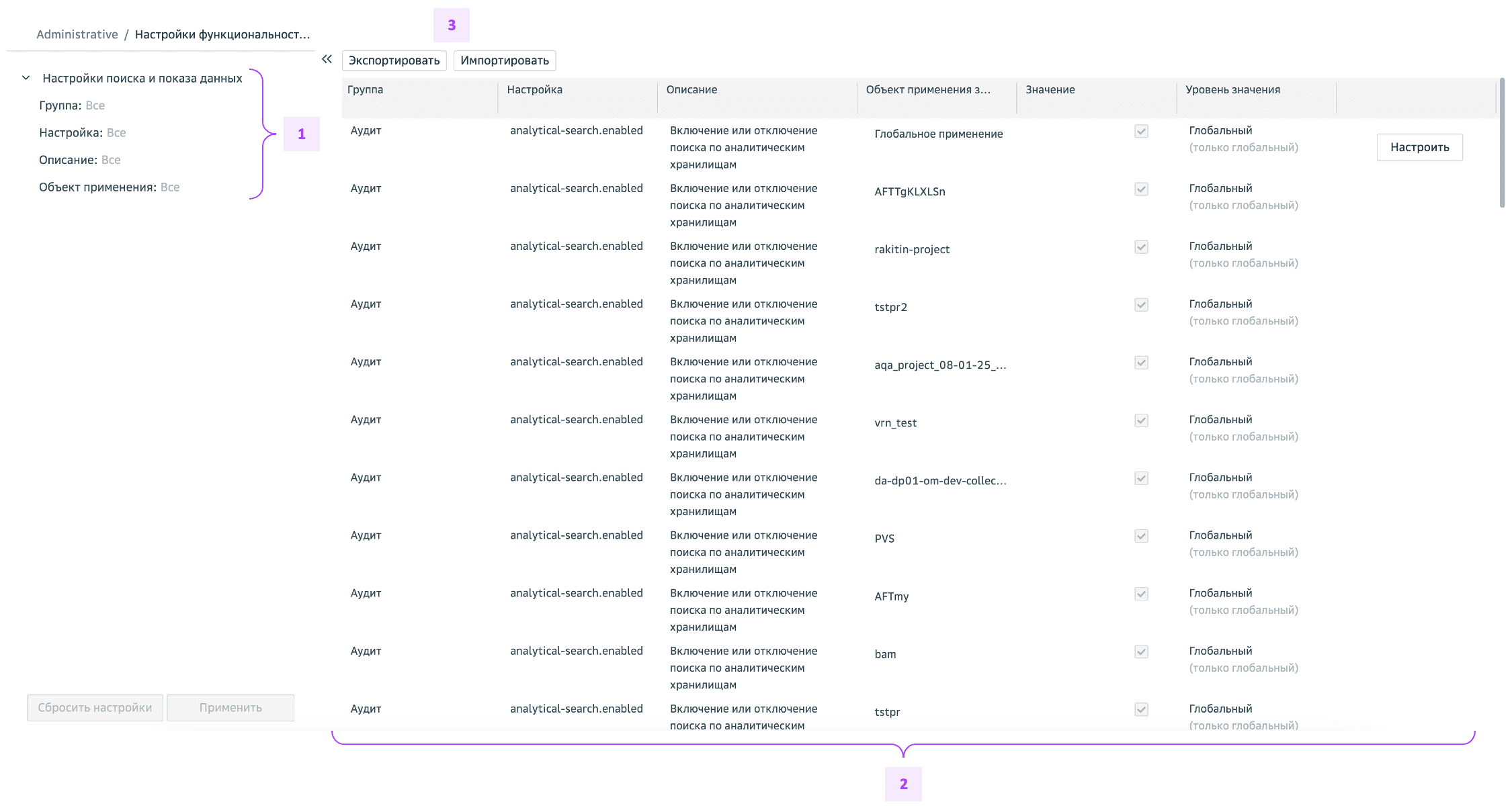 Блок фильтрации параметров настроек функциональности. В этом блоке можно проводить отбор по критериям: