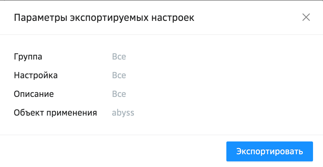 Нажать кнопку «Экспортировать» над результирующей таблицей. После этого откроется окно с параметрами эспортируемых настроек, в котором можно проверить условия выборки.