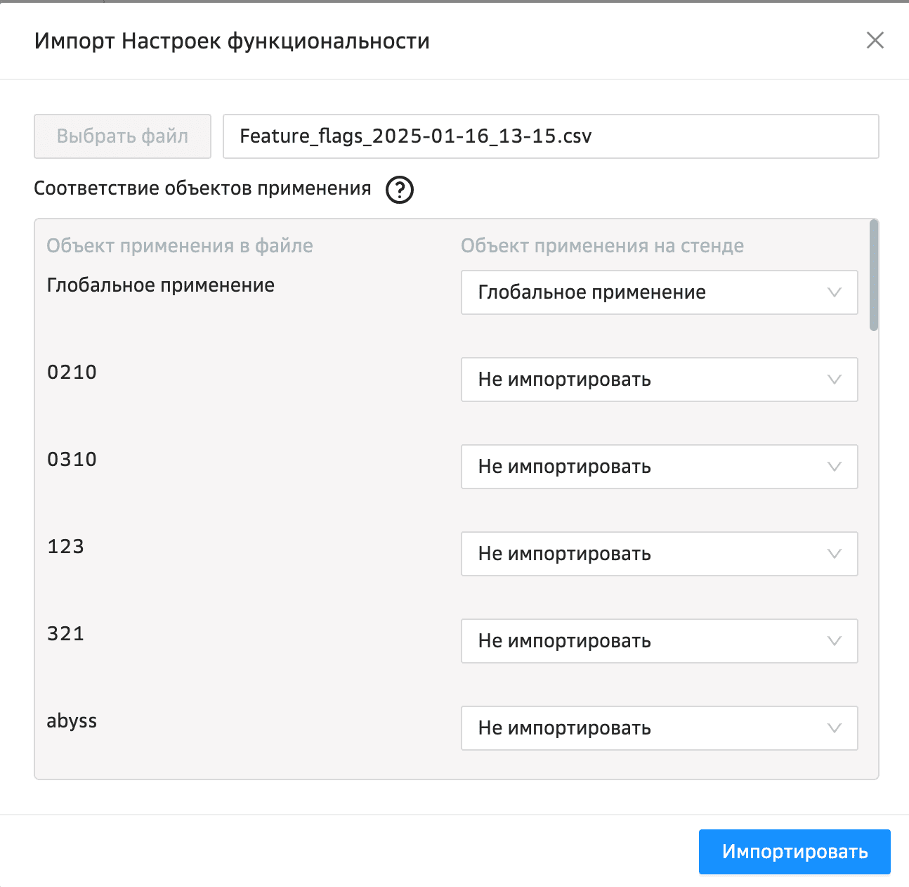 Объект применения на стенде - объекты, для которых нужно применить значения настроек из файла. Доступны варианты выбора из выпадающего списка.