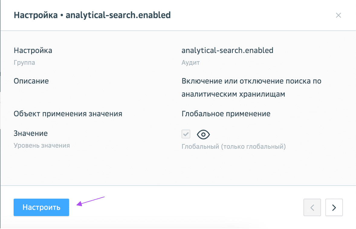 Также окно настройки функциональности можно вызвать, нажав на строку с искомой настройкой в таблице и в открывшемся окне с подробной информацией о настройке, нажать кнопку «Настроить».
