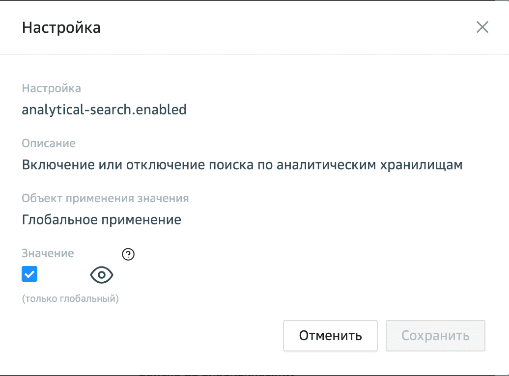 - значит данная настройка на проектном уровне будет видна в таблице настроек функциональности пользователям с привилегиями FEATURE_SETTINGS_EDIT и FEATURE_SETTINGS_VIEW. Если же отметка в виде «перечеркнутого глаза» - данная настройка на проектном уровне будет отсутствовать в таблице настроек функциональности у пользователей с привилегиями FEATURE_SETTINGS_EDIT и FEATURE_SETTINGS_VIEW.