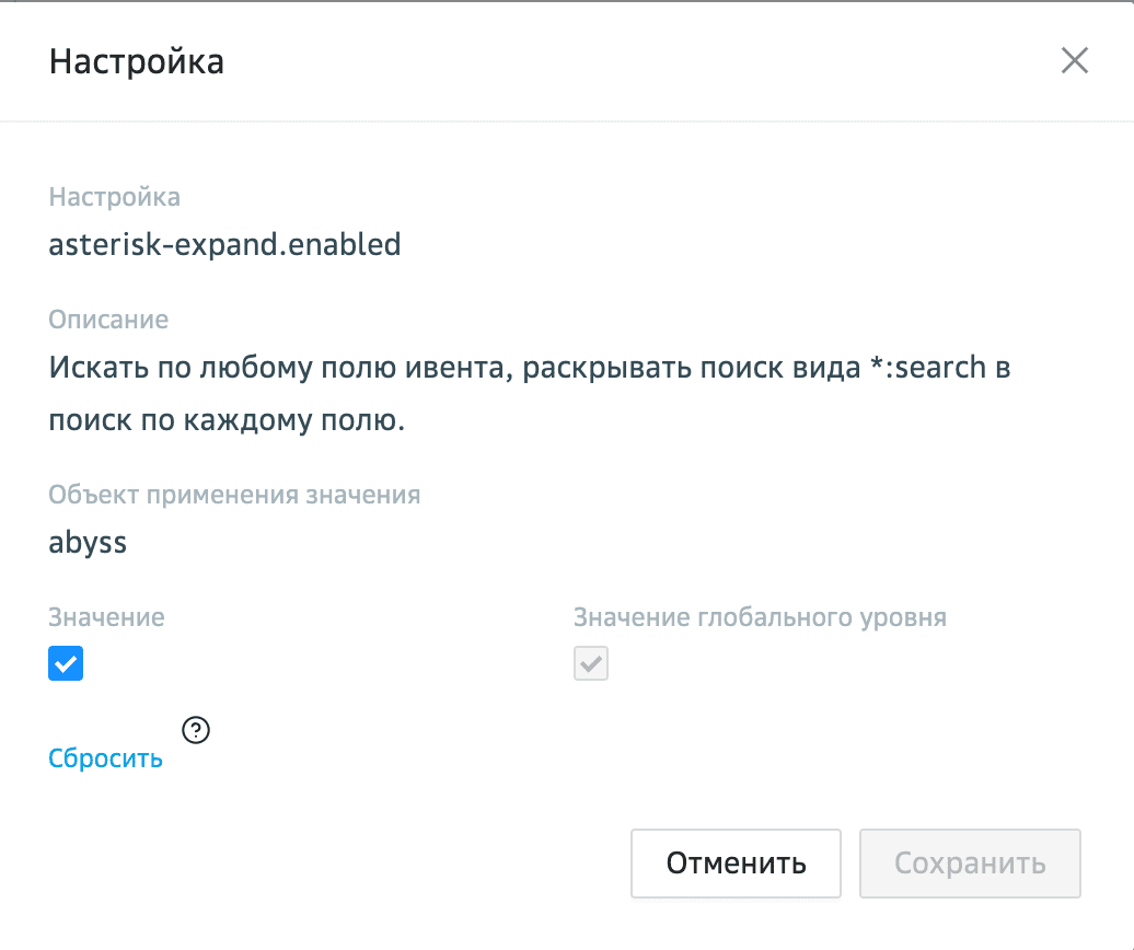 Если значение настройки функциональности, установленное на проект, отличается от глобального, то его можно сбросить до глобального значения, которое указано в этом окне. Для этого нужно нажать кнопку «Сбросить».