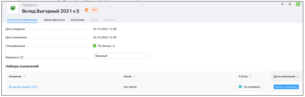 На панели основных вкладок расположены основные вкладки главной страницы Продукта.