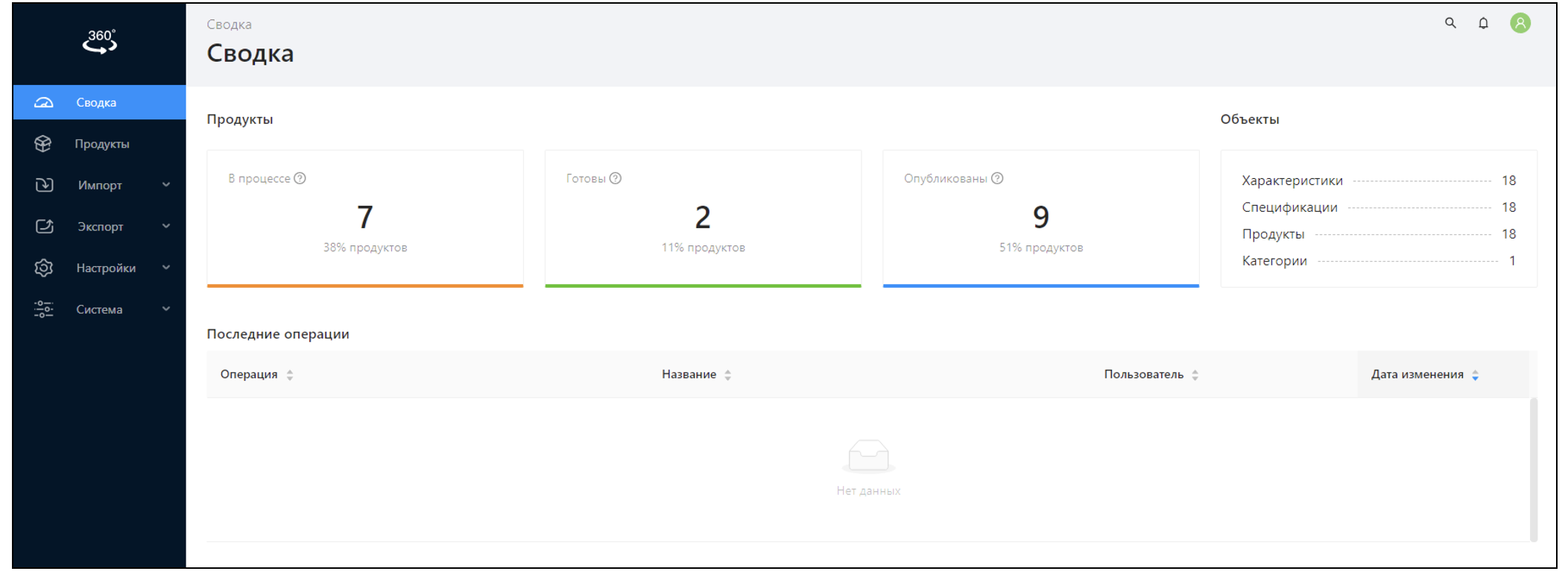Содержит информационный блок о продуктах, объектах и последних операциях |