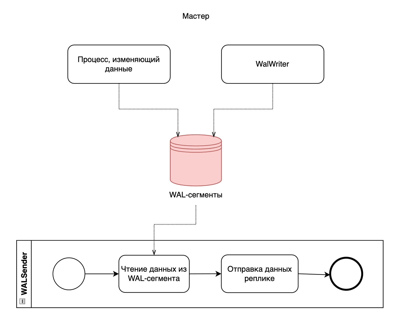 Процессы, влияющие на данные, перед фиксацией изменений помещают данные о выполнении в WAL-буфер, находящийся в разделяемой памяти. По мере заполнения циклического WAL-буфера данные сбрасываются на диск. Сброс осуществляется процессом, который добавляет новую запись или процессом WALWriter. Сброс на диск осуществляется не только по причине переполнения WAL-буфера, но и по таймеру. WALSender отправляет зафиксированные на диске WAL-записи для дальнейшего применения на реплике. Экземпляр реплики находится в состоянии постоянного восстановления - проигрывания WAL-записей с диска.