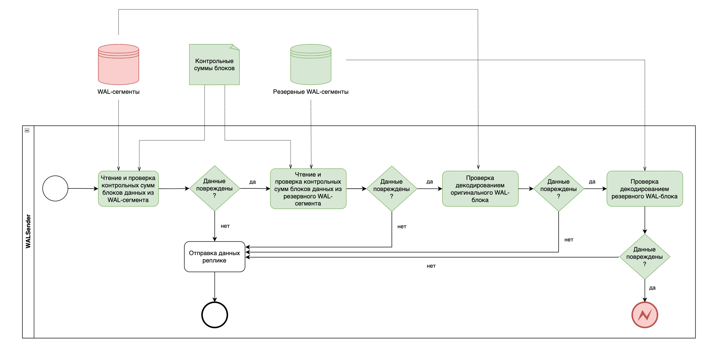 wal_sender_check_crc- при включении этого параметра функциональность запускается. Параметр выключен по умолчанию, изменить его значение можно только на старте сервера. При значении параметраonпри запуске сервера инициируется процесс WALRecoveryWriter, а в разделяемой памяти создается очередь сообщений при передаче данных для сброса резервной копии WAL-данных на диск.wal_sender_panic_on_crc_error- при невозможности восстановления поврежденных WAL-данных, процесс WALSender поднимает ошибку уровняPANIC, когда данный параметр включен. По умолчанию параметр имеет значениеoff(выключено). В этом случае при невозможности восстановления поврежденной записи поднимается ошибка уровняFATAL. Параметр применяется только при включенном параметреwal_sender_check_crc.wal_sender_check_type- при значении параметраrecordиспользуется метод проверки корректности данных путем декодирования. При значенииblockиспользуется метод проверки контрольных сумм читаемых блоков. При значенииrecord, blockиспользуется гибридный метод. Параметр применяется только при включенном параметреwal_sender_check_crc. По умолчанию параметр имеет значениеrecord.Функциональность включает три способа контроля целостности:
