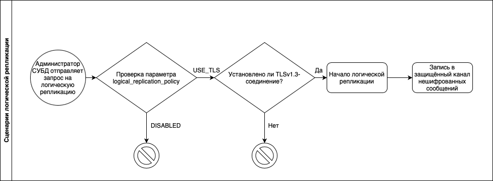 DISABLED— запрещает логическую репликацию. Это значение по умолчанию.USE_TLS— предписывает удостовериться, что установлено TLS-соединение, после чего сообщения передаются без дополнительного преобразования. При этом значении проверка наличия TLS-соединения будет осуществляться один раз — при попытке установить соединение для логической репликации. Если соединение не соответствует требованиям TLSv1.3, репликация завершится с ошибкой.