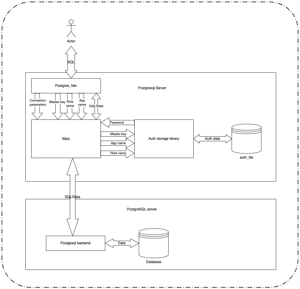 Расширение или утилита передает в библиотеку работающую с хранилищем паролей через драйвер libpq мастер-ключ, обфусцированный и сгенерированный при компиляции. Аналогичный ключ закодирован в библиотеке хранилища паролей. Ключ сверяется, и в случае совпадения флаг возможности обращения к хранилищу устанавливается в значение |