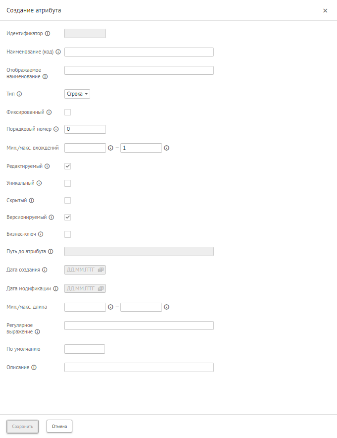 Нажмите на кнопку Добавить. Откроется модальное окно Создание атрибута.