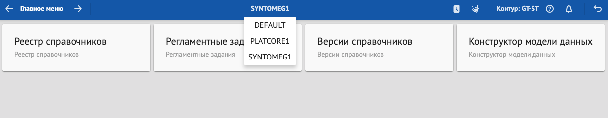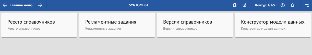 Во всех разделах рабочей области (Реестр справочников, Регламентные задания, Версии справочников, Конструктор модели данных) отображается тот перечень доменов и справочников, который соответствует выбранному проекту (по кнопке Доступные проекты).