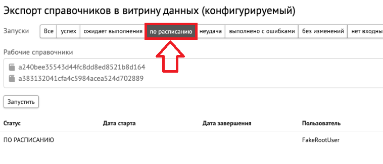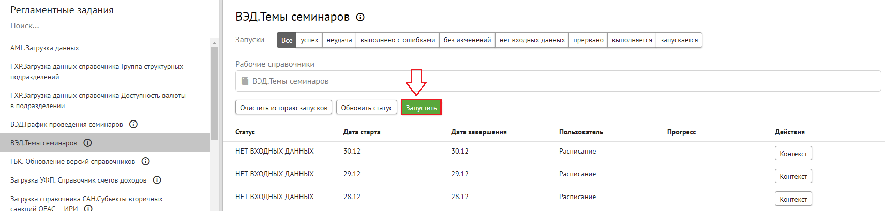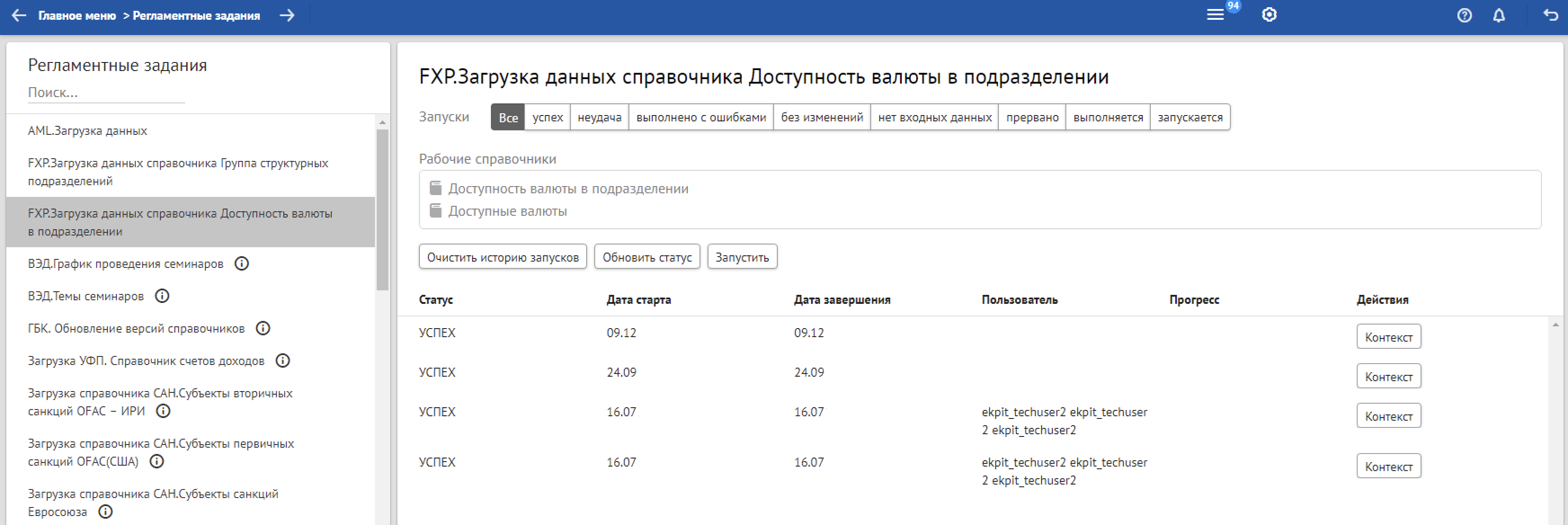 Список запуска регламентных заданий (значок «Список») — для просмотра списка запусков регламентных заданий. Обозначена номером 4 на рисунке Главной экранной формы;