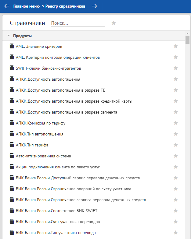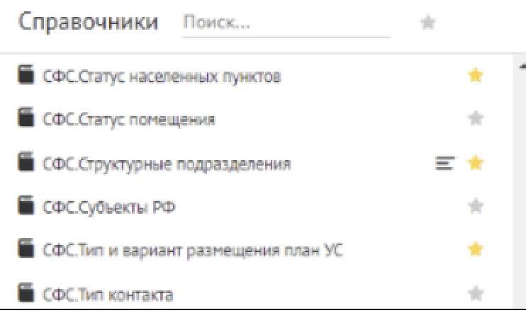 Для того, чтобы в реестре справочников отобразились «избранные» справочники, нужно в строке поиска нажать значок «звездочка»