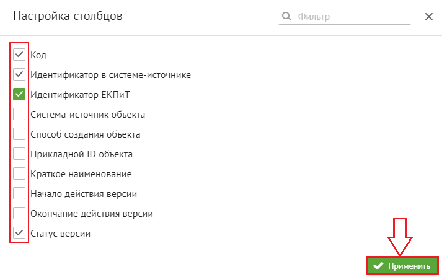 Нажмите кнопку Применить для применения указанных условий фильтрации. В результате в справочнике будут отобраны записи, соответствующие заданным атрибутам.