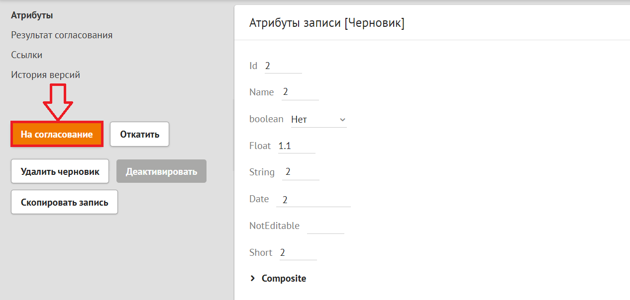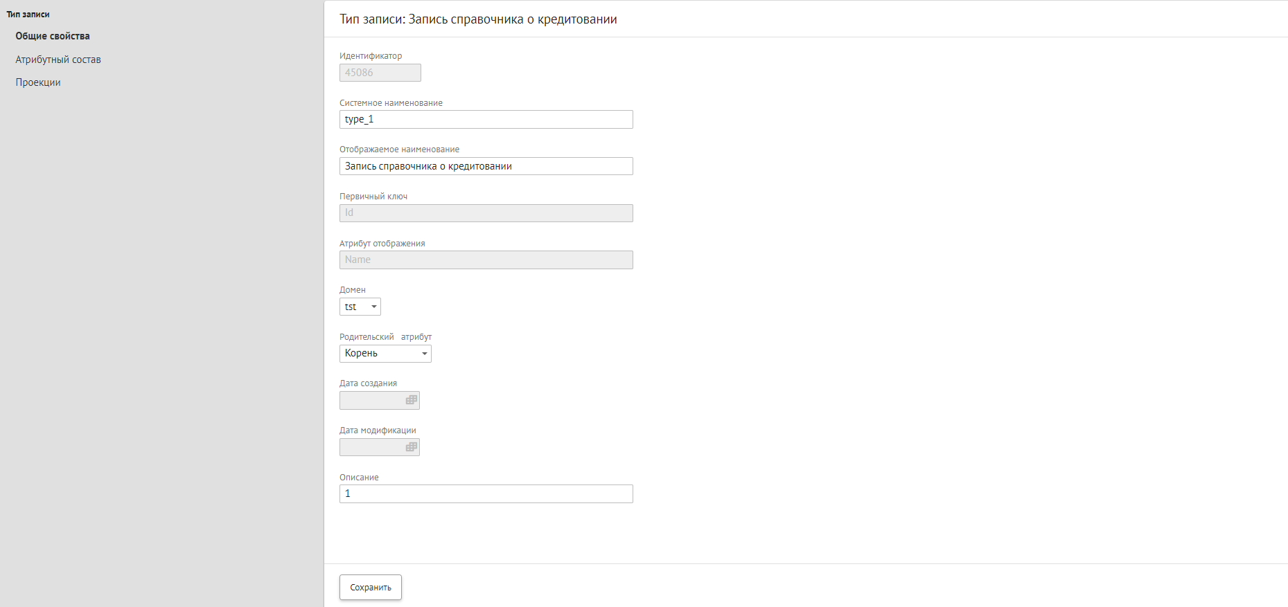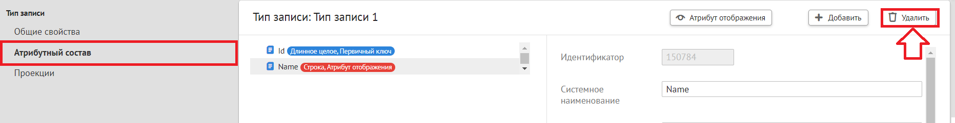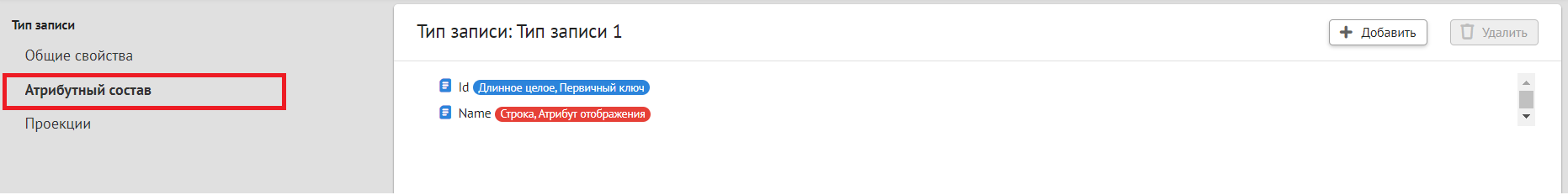 В форме редактирования типа записи в левой части карточки перейдите в раздел Атрибутивный состав.