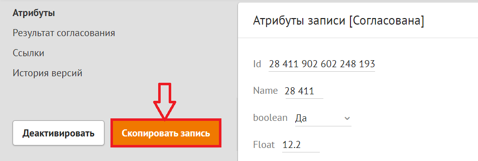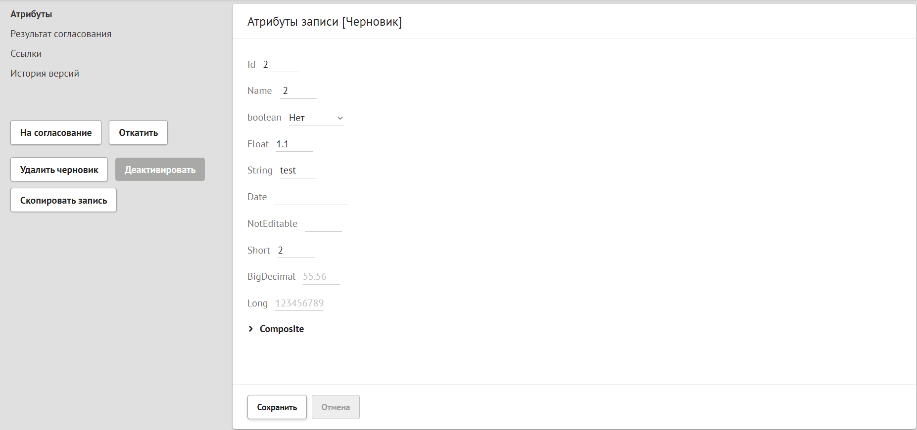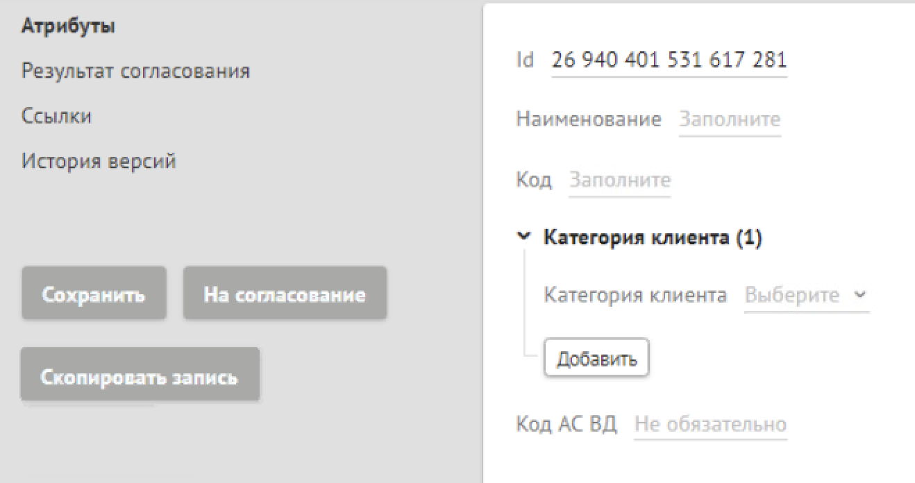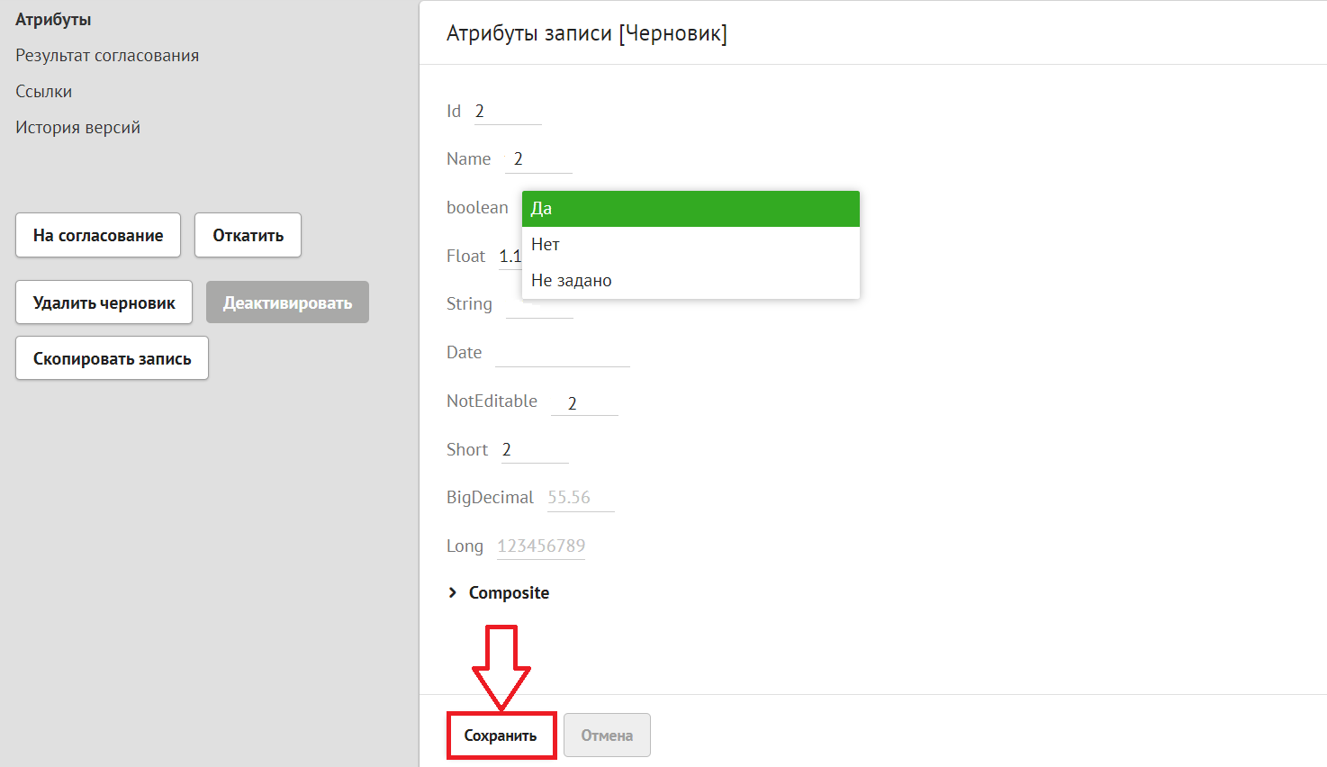В форме редактирования типа записи в левой части карточки перейдите в раздел Атрибутивный состав.