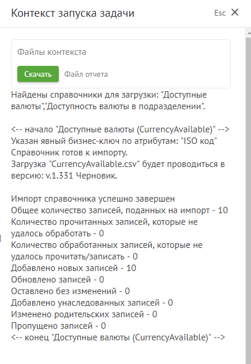 В этом случае следует посмотреть контекст/скачать отчет с описанием возникшей ошибки. Возможны ошибки в структуре справочника, незаполненном обязательном атрибуте и т.д. Следует устранить ошибку в файле и повторно произвести импорт данных.