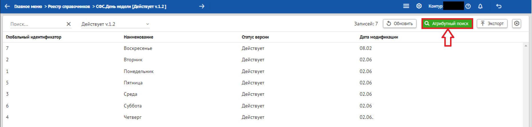 Для навигации и просмотра значений справочников в системе реализован Атрибутный поиск (пример с атрибутным поиском будет показан на примере СФС.День недели).