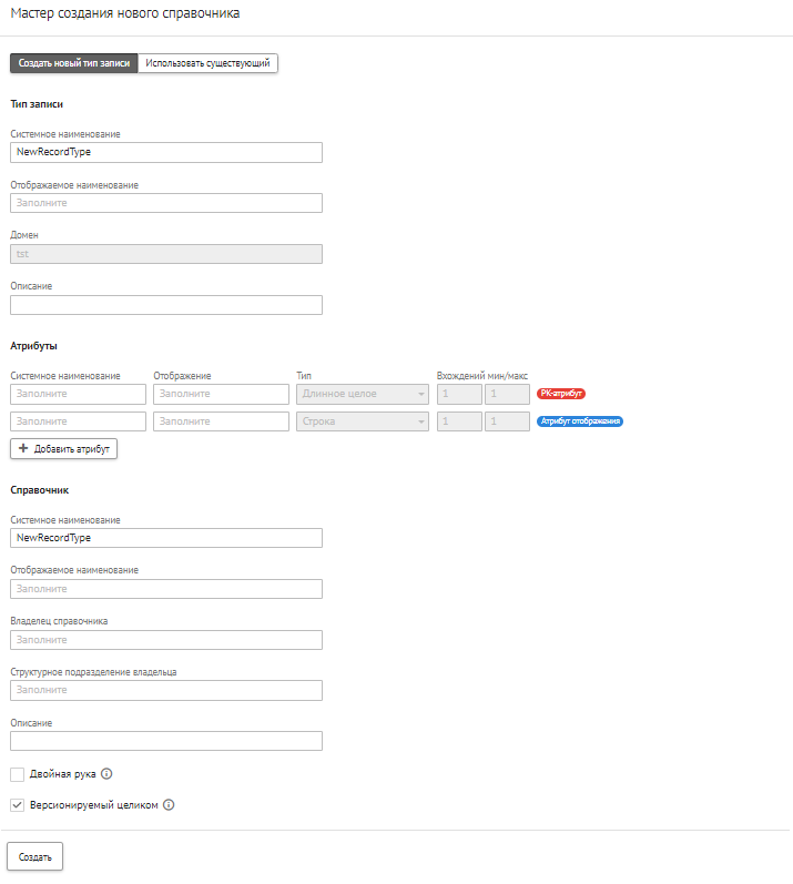 В форме создания Новый справочник заполните необходимые параметры и нажмите на кнопку Создать.