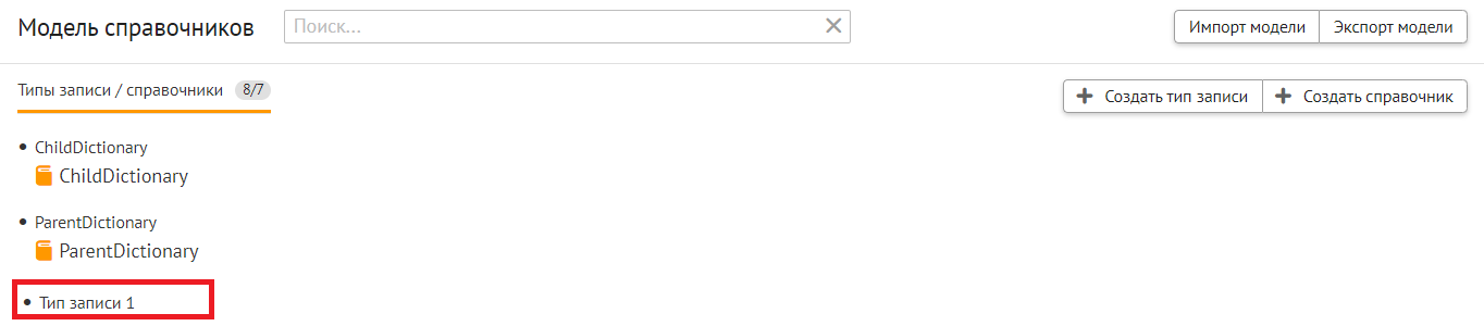 Справочники в блоке «Конструктор модели данных» создаются на основе типа записи. На одном типе записи можно создать несколько справочников, также и один тип записи можно использовать для разных справочников.