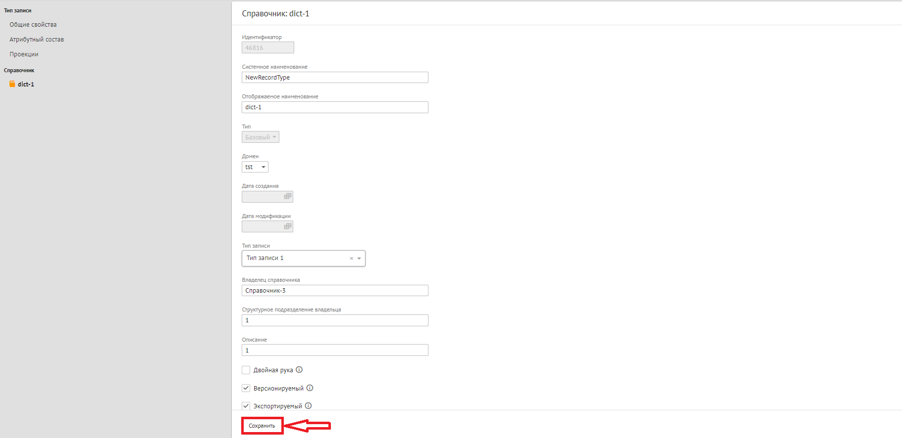 На вкладке Свойства справочника измените нужные параметры и нажмите на копку Сохранить.