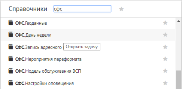 В поисковой строке введите название нужного справочника (поиск отрабатывает «на лету» т.е. возможен ввод не полного наименования). Например, введите «сфс» и в отработанном поиске найдите нужный справочник — СФС.День недели.