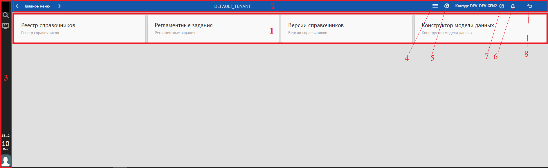 Боковая панель — содержит имя пользователя, информацию о текущей дате (число и месяц) и времени, а также кнопку Возврат в главное меню (значок «Монитор»), предназначенную для возврата в главное меню системы.