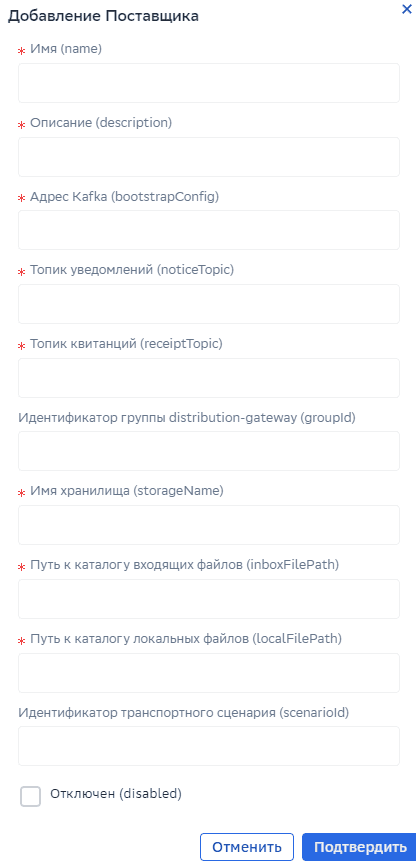 «Добавить поставщика», «Удалить поставщика», «Редактировать поставщика», «Запустить Распространение», «Отключить поставщика» |
