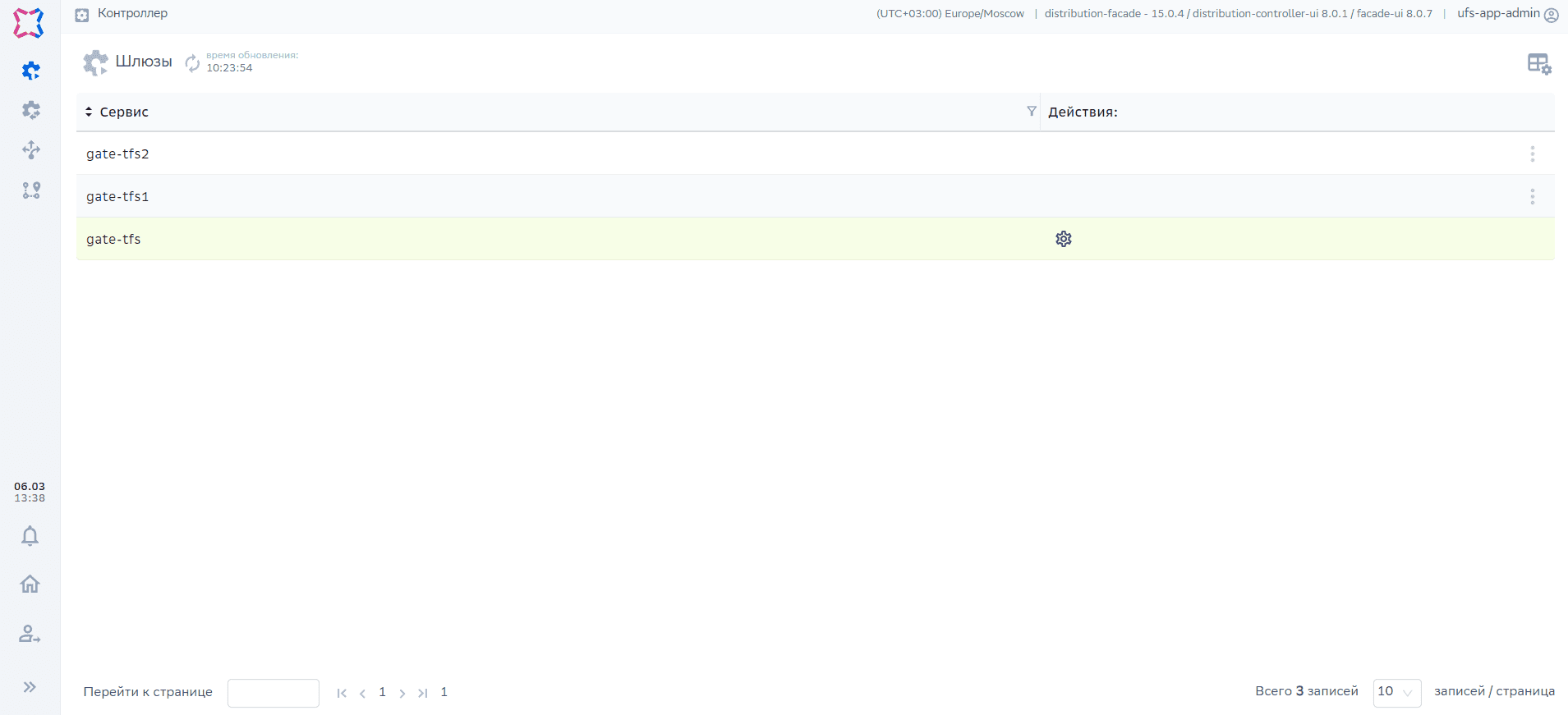 Контроллер –> Шлюзы –> Шлюз ТФС –> Настройки |
