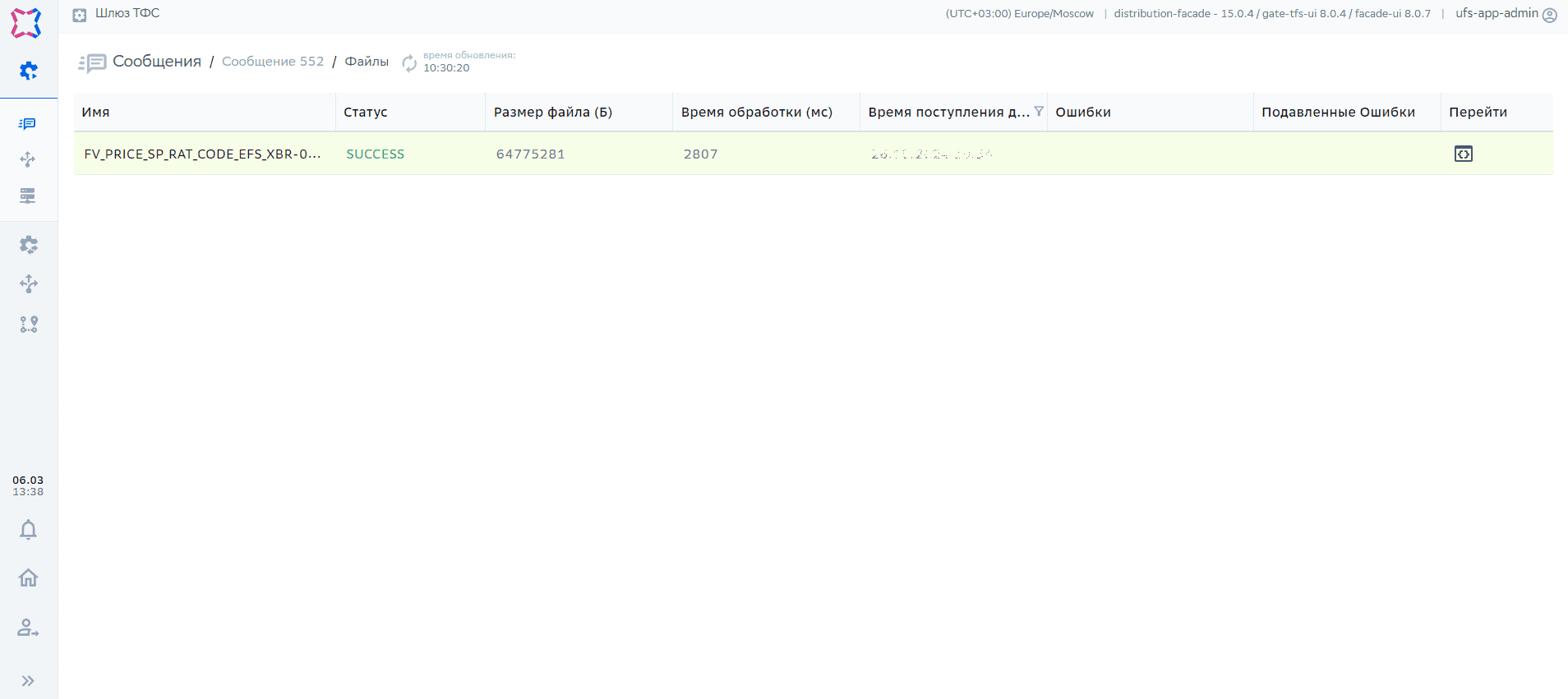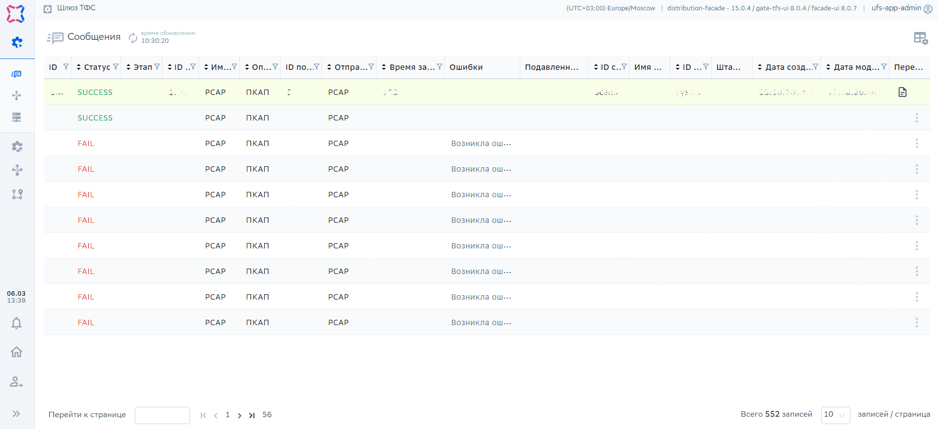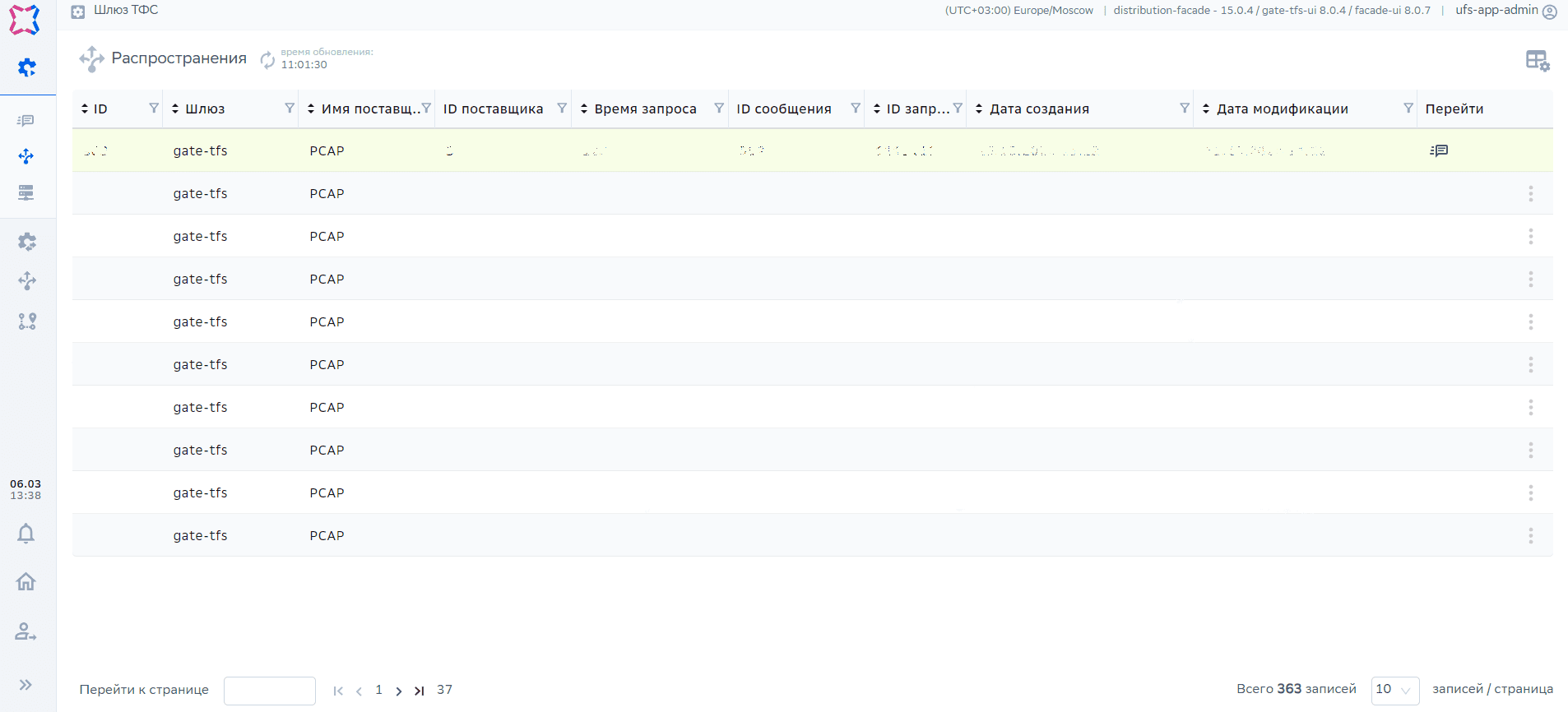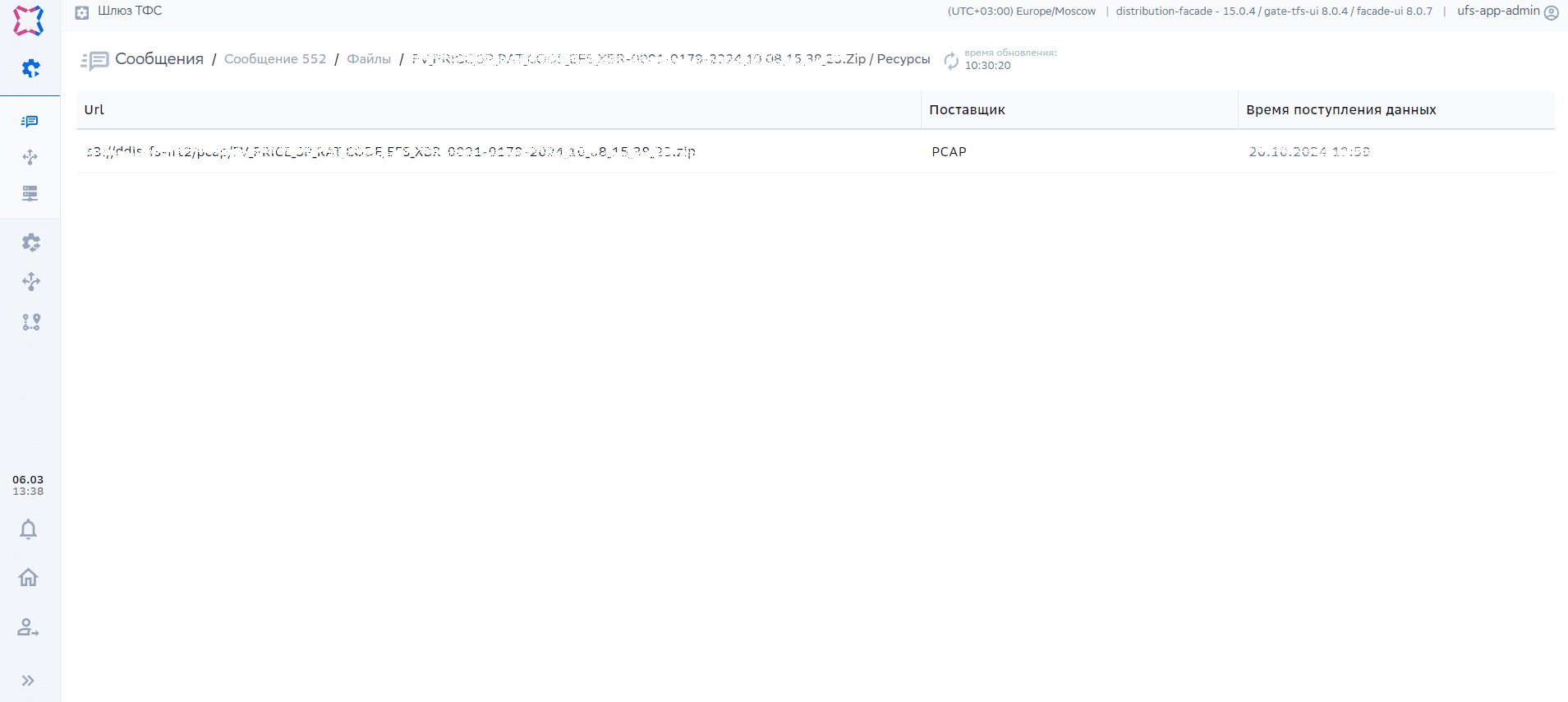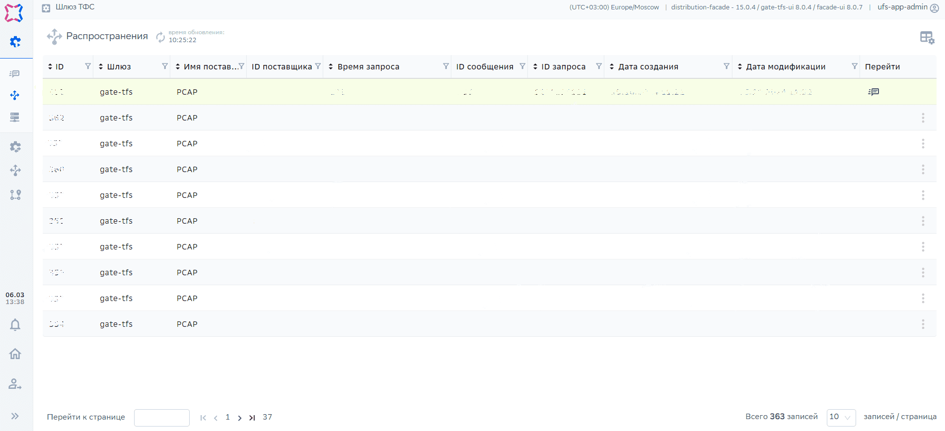 Контроллер –> Шлюзы –> Шлюз ТФС –> Распространения –> Сообщения |