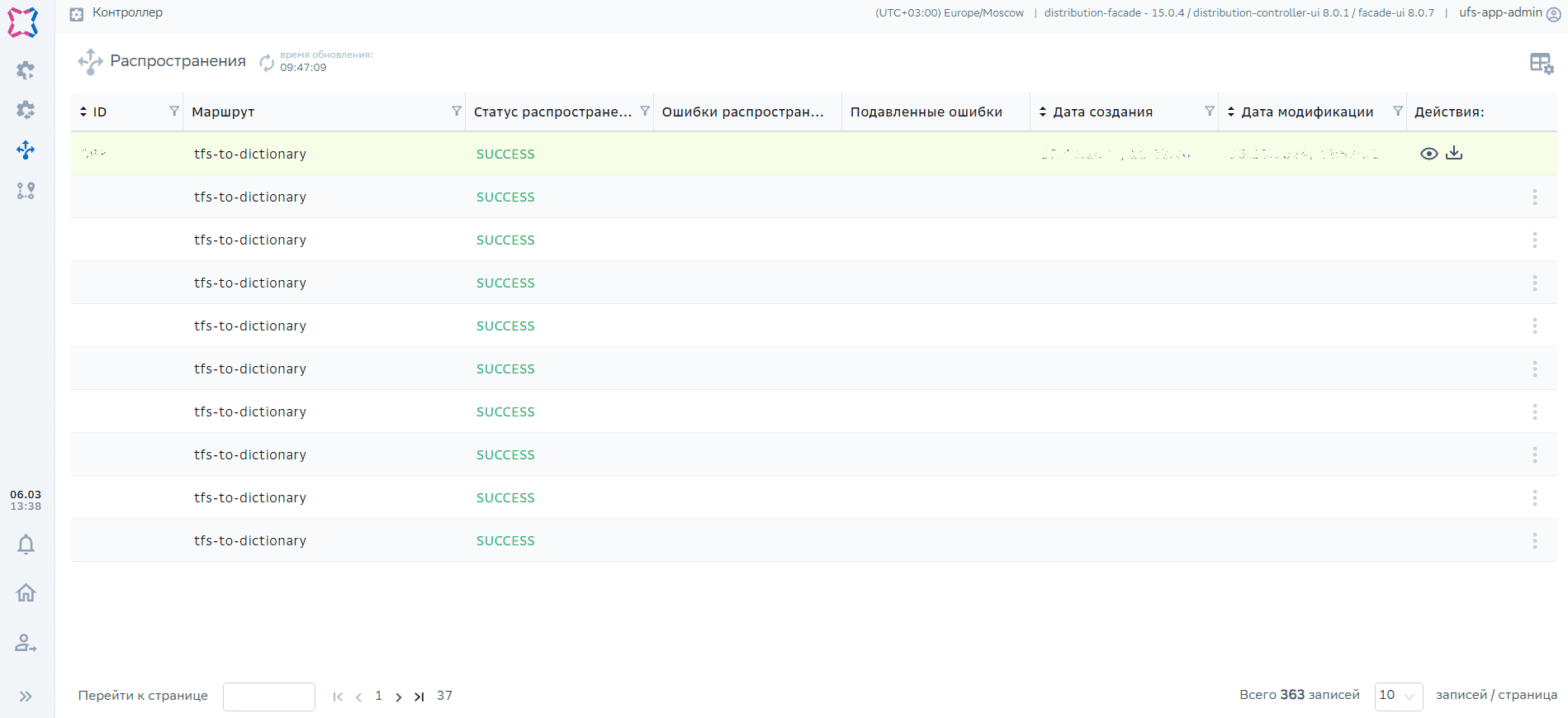 «Просмотреть Распространение», «Скачать Распространение». Также для Распространений в статусе ERROR доступны кнопки «Завершить», «По лимиту» |