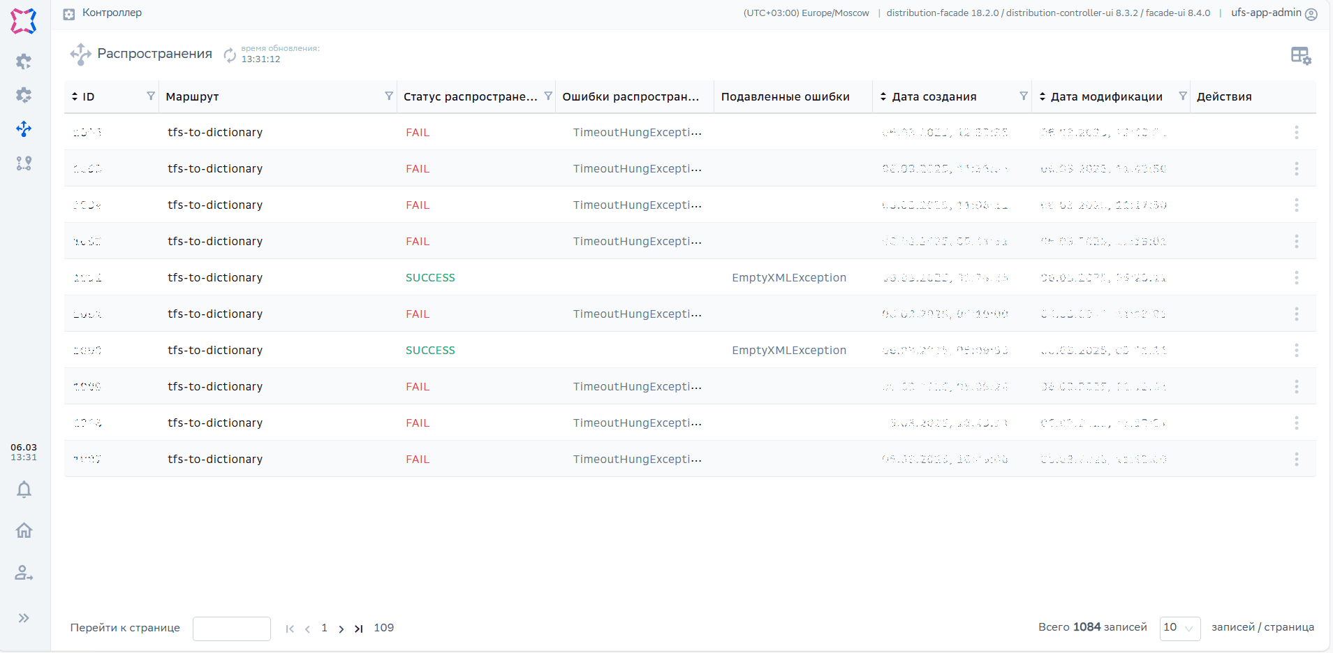 в таблице распространений подавленная ошибка с выбранным типом не отображается (как для текущего распространения, ранее обработанных, так и новых).