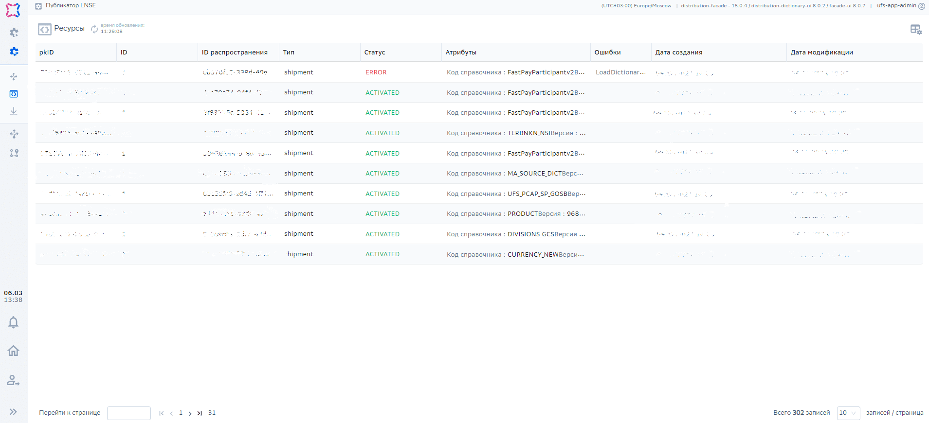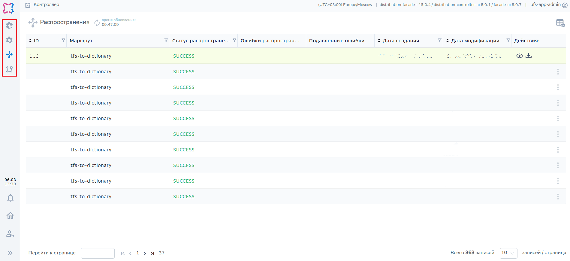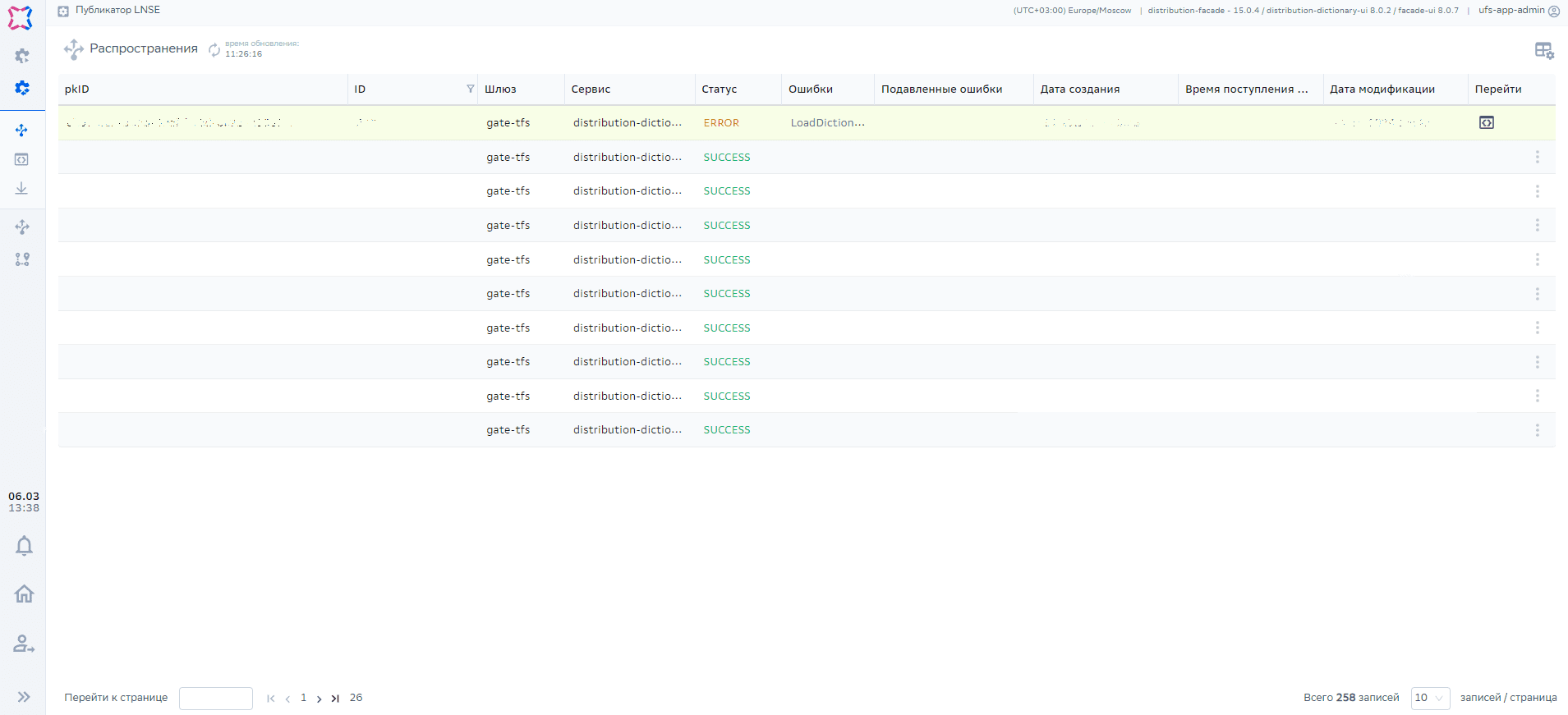 Окно с управлением распространениями в статусе ERROR. На данной форме доступны тумблеры